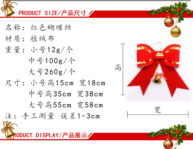 材质:绒植布 重量:12cm 8克左右 18cm12克左右 35cm 120克 55cm 270克  适用于装饰圣诞树、圣诞花环、藤条等!