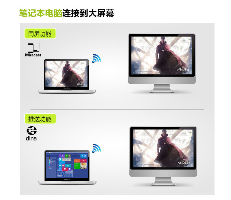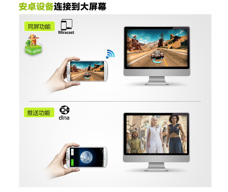 Output audio, video, images, and documents on TV and projectors, compatible with both DLNA/Miracast modes. Switch modes according to different devices (smartphones, tablets, laptops), enabling true cross-platform screen sharing and push.