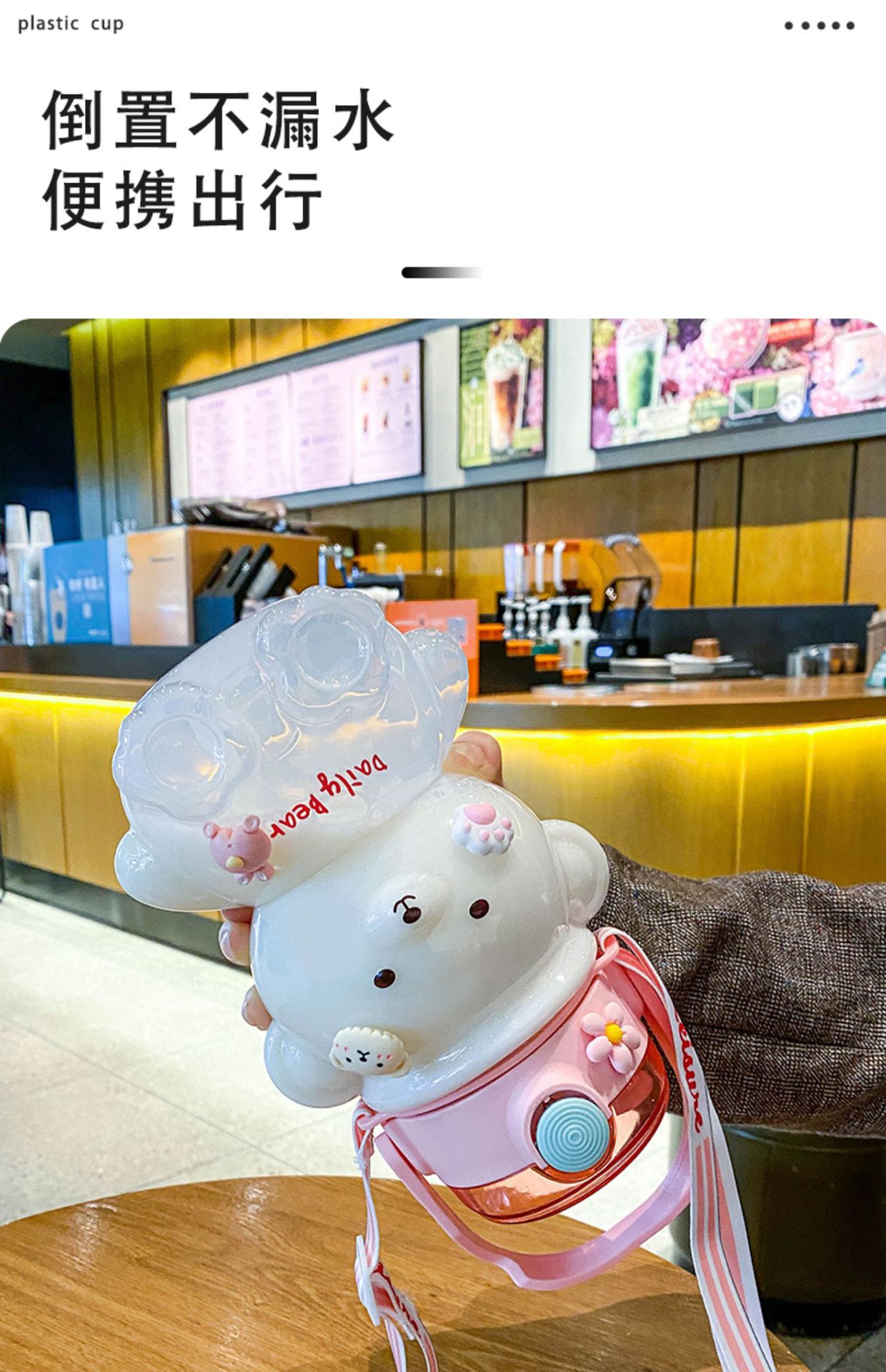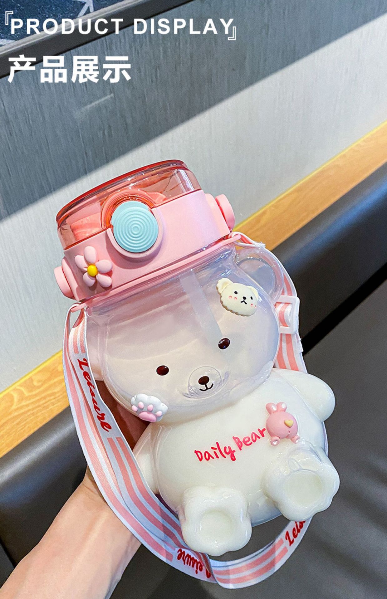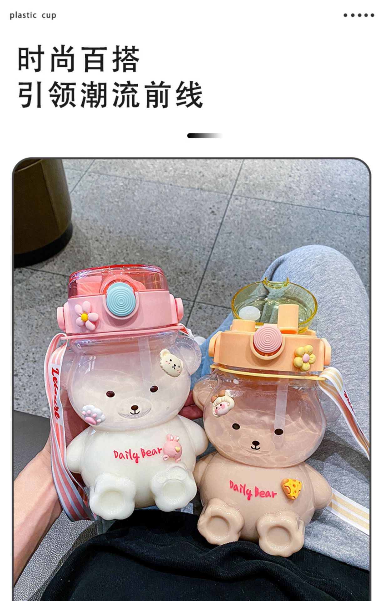 Bear Water Cup Large Capacity Girl Cute Good-looking Cup with Straw Summer Student Portable Strap Double Drink Plastic Cup 中文版