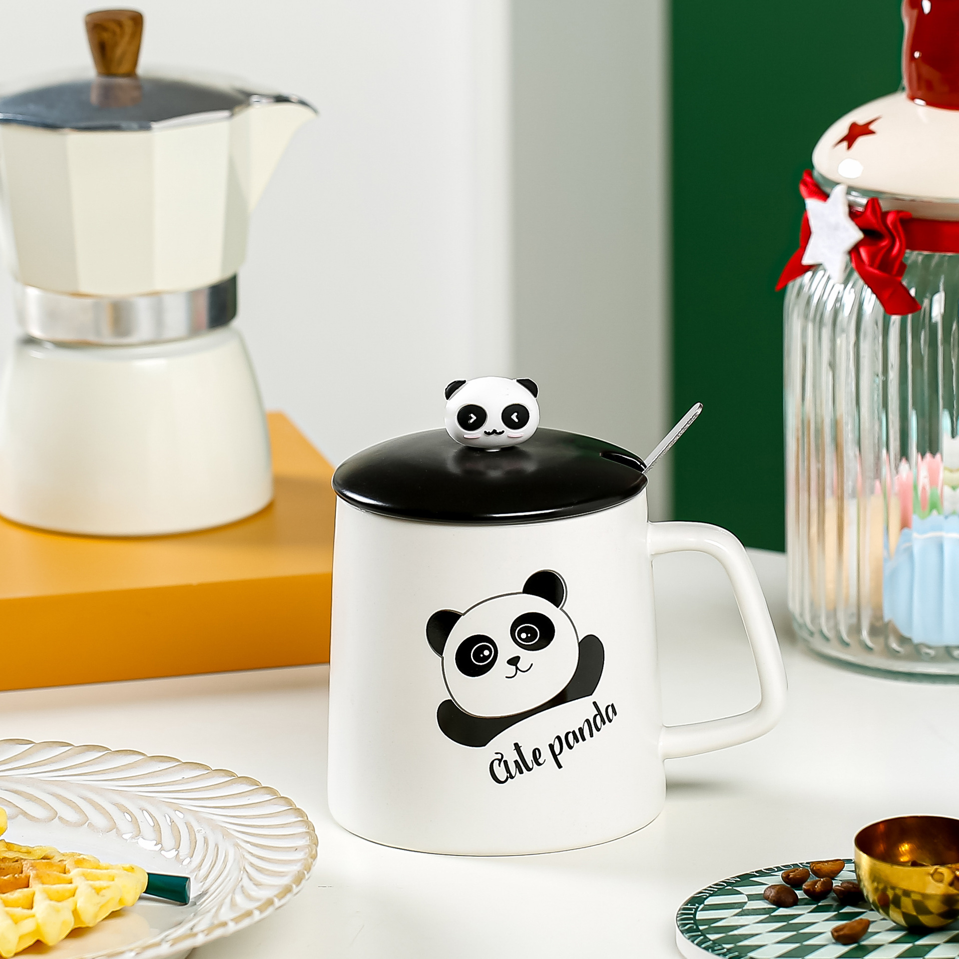 cute panda ceramic cup office water glass student mug coffee cup with cover with spoon stereo silicone cup cover