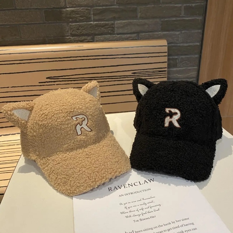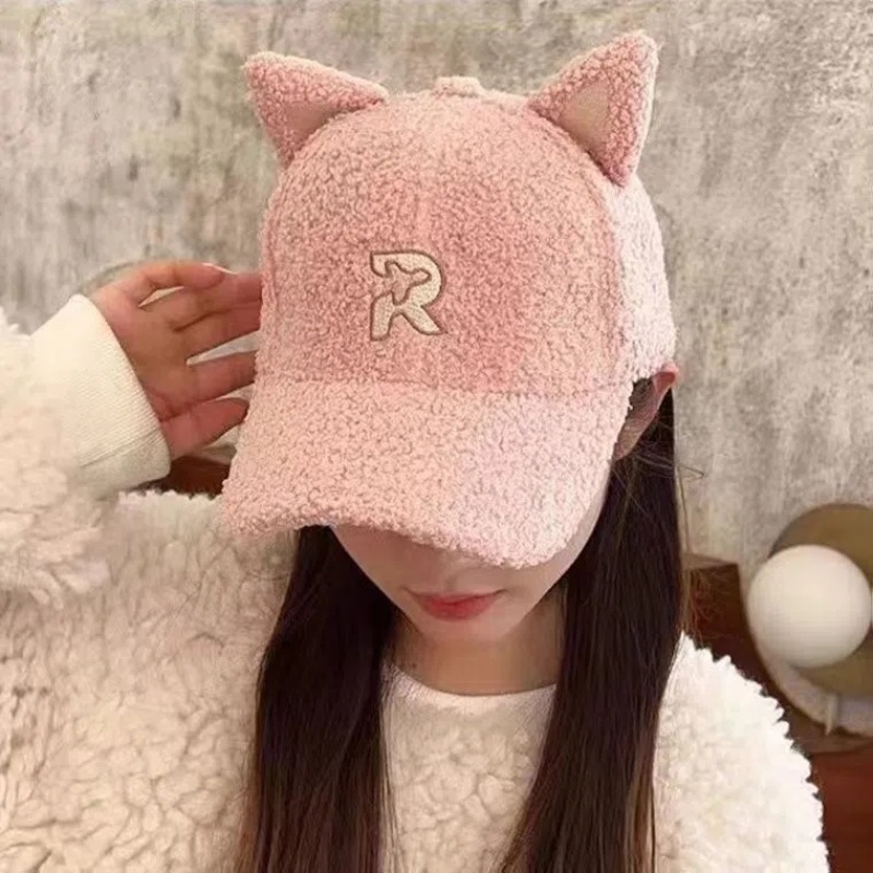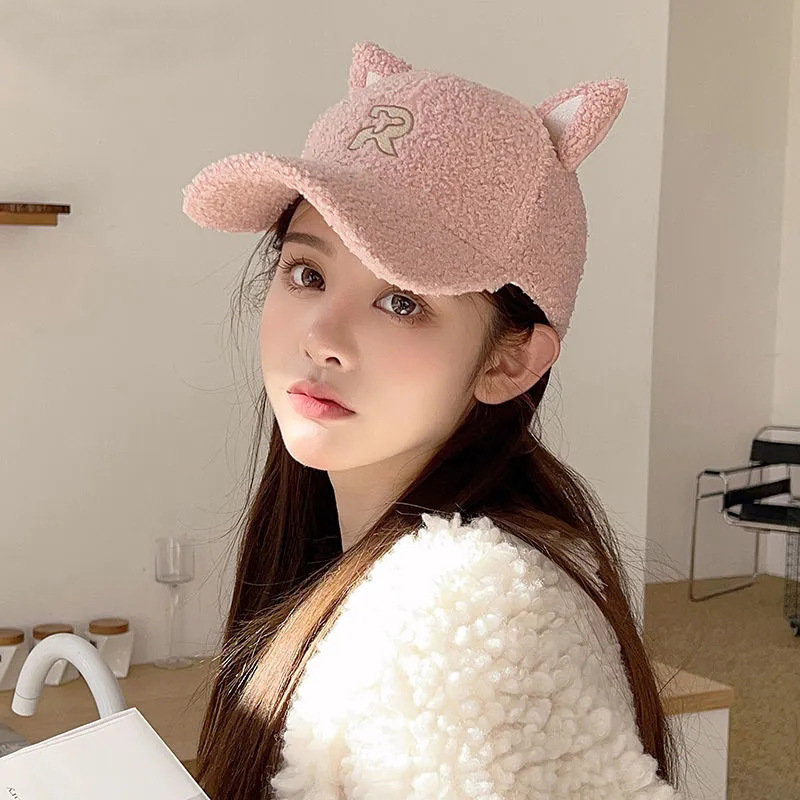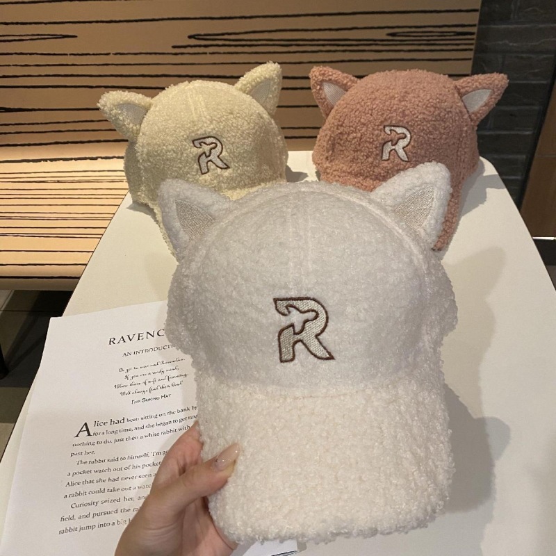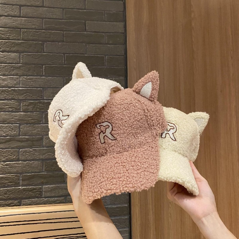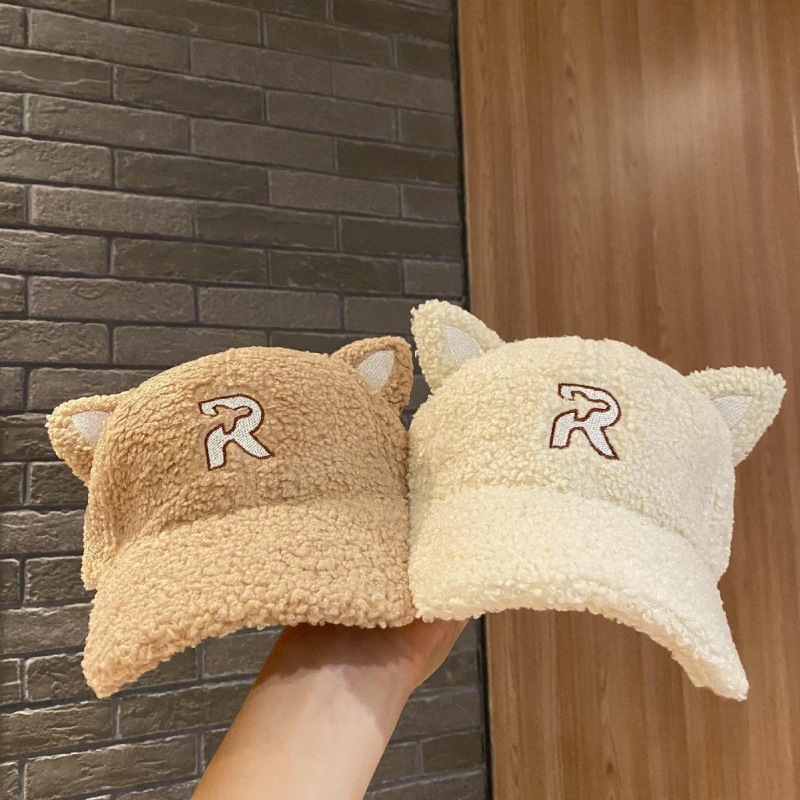 new autumn and winter korean style embroidered r letter lambswool warm parent-child baseball cap cartoon cute cat ears peaked cap 中文版