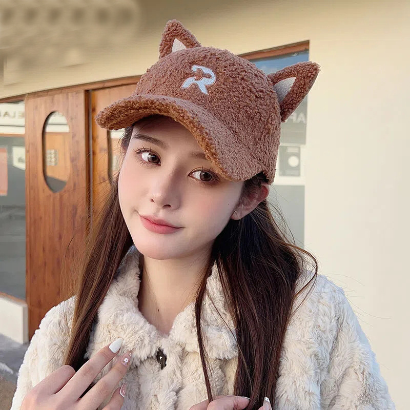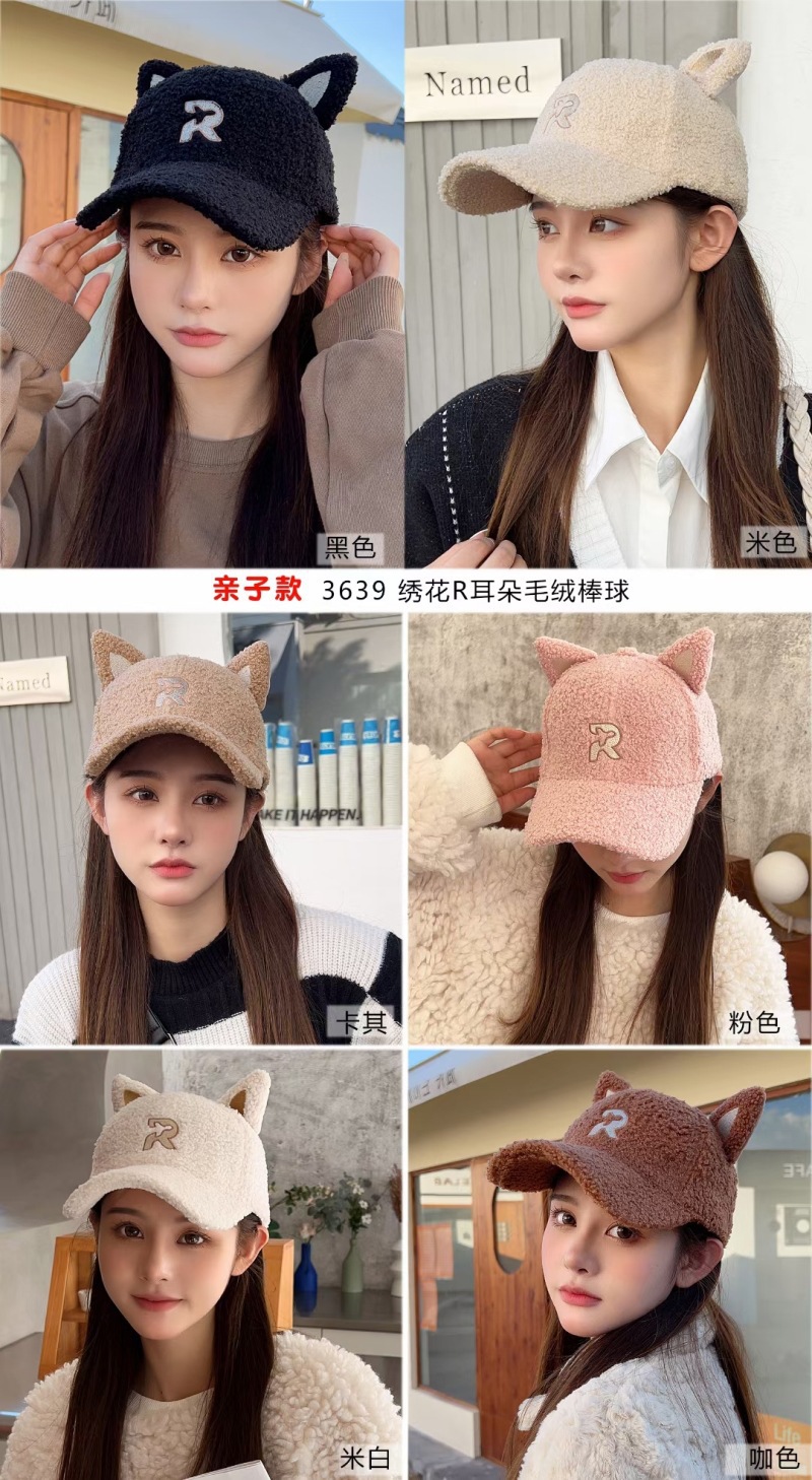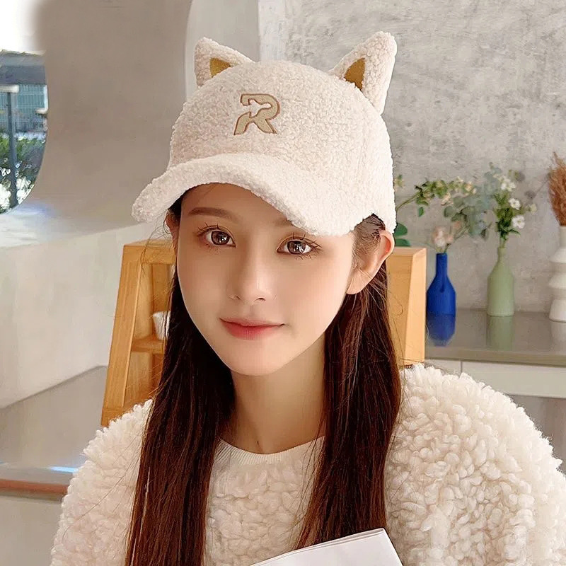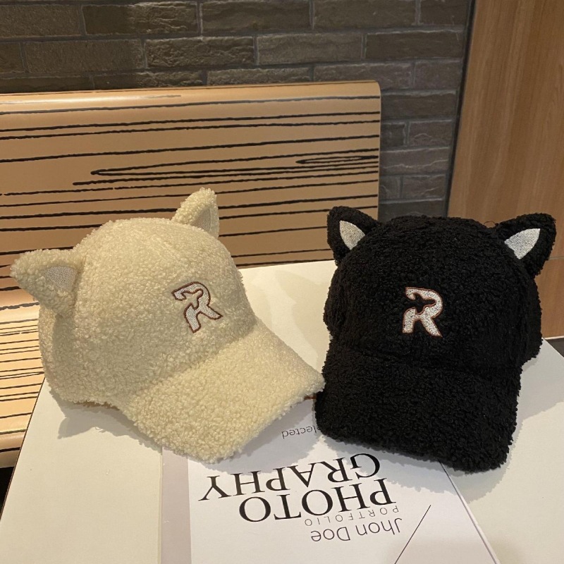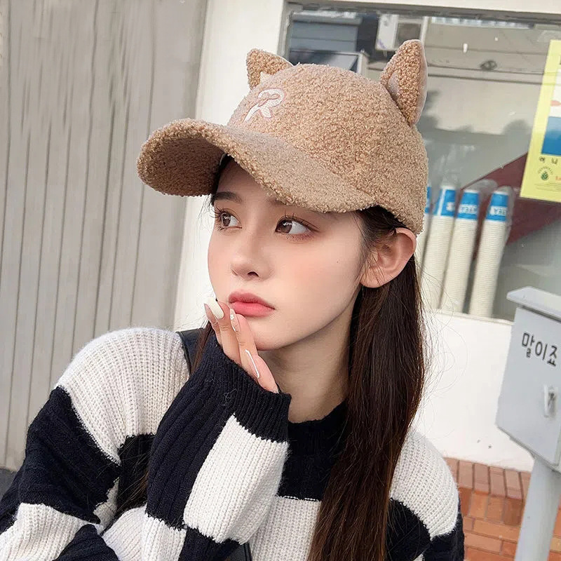 new autumn and winter korean style embroidered r letter lambswool warm parent-child baseball cap cartoon cute cat ears peaked cap 中文版