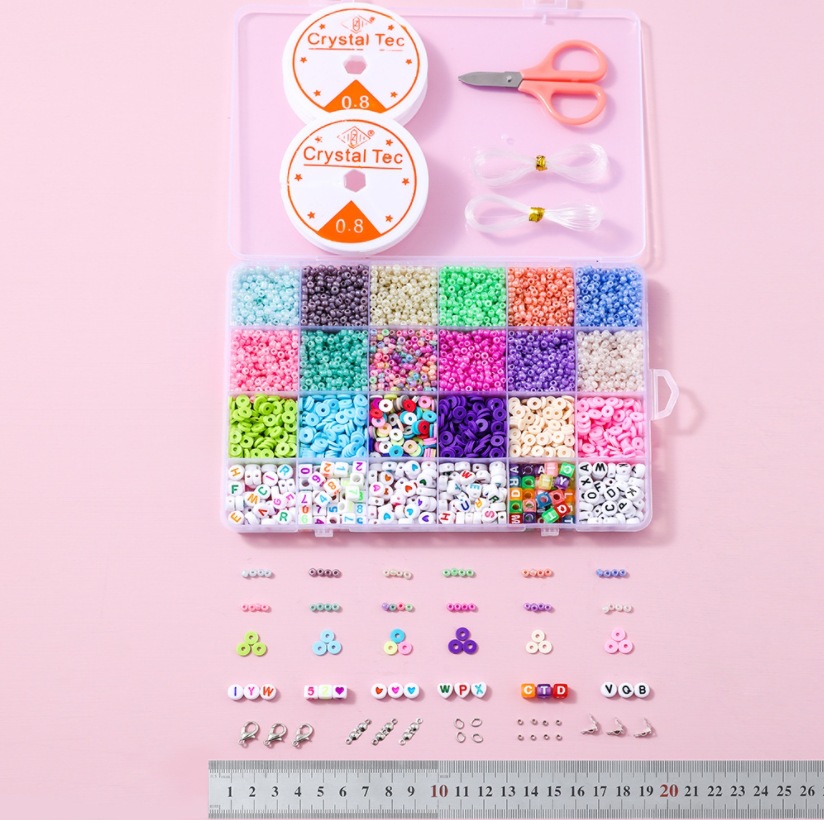 quantity: small rice-shaped beads about 450 pieces per grid, 180 pieces of soft pottery, 60 round beads, 40 square beads, 1 pair of scissors,2 rolls of transparent wire, Filament 2 rolls, lobster buckle 5 pieces, bag buckle 20 pieces, ball plunger 20 pieces, closed ring 20 pieces