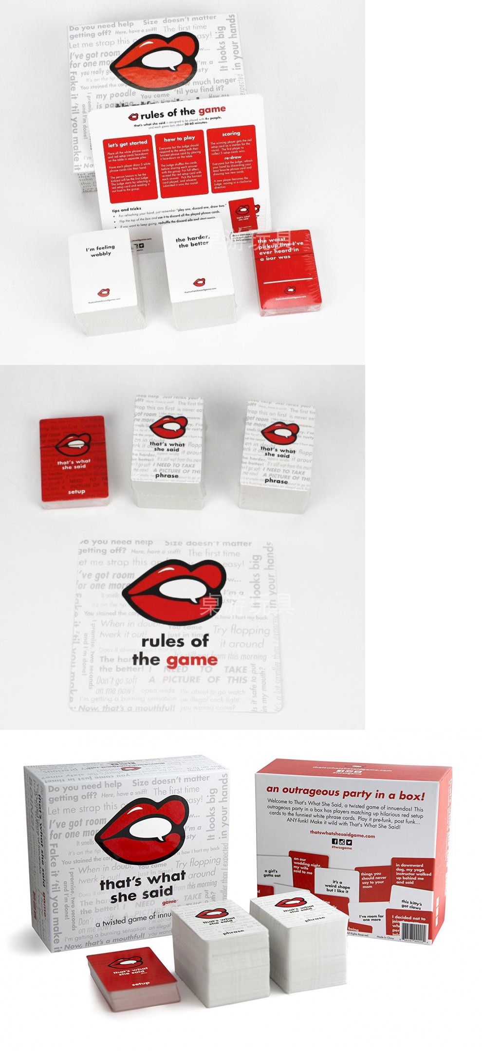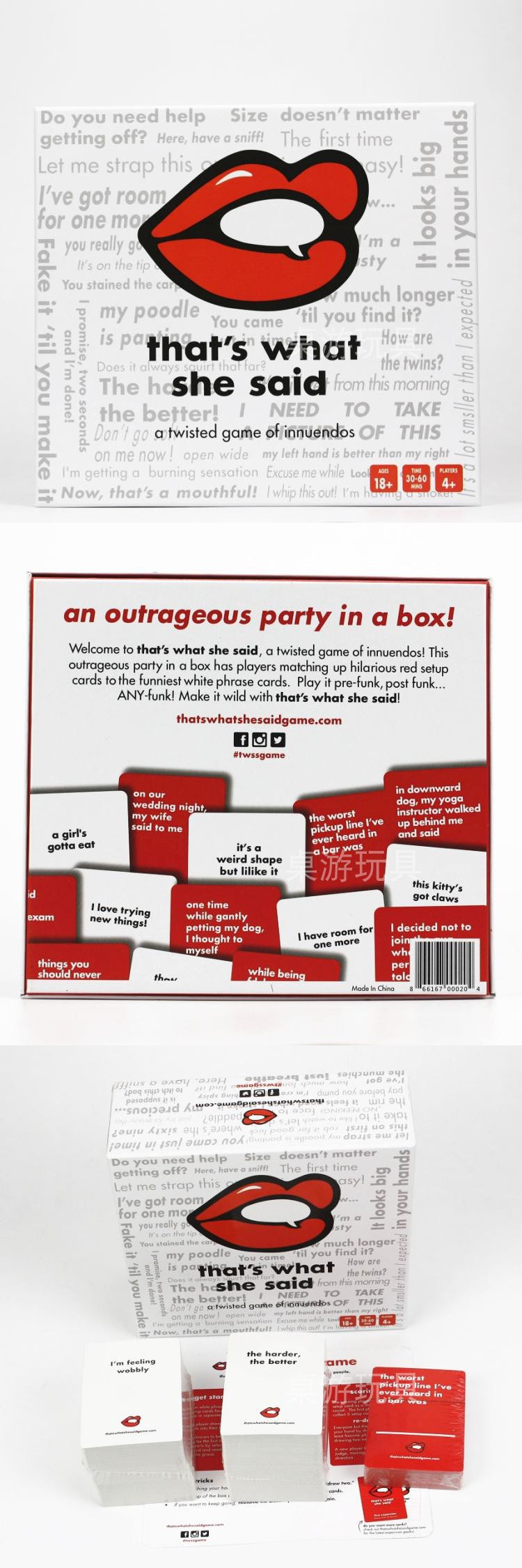 Welcome to This Is Her Say Game, the party game of twisted reflections! Inside this square box, players match red setup cards with the humorous white phrase cards.