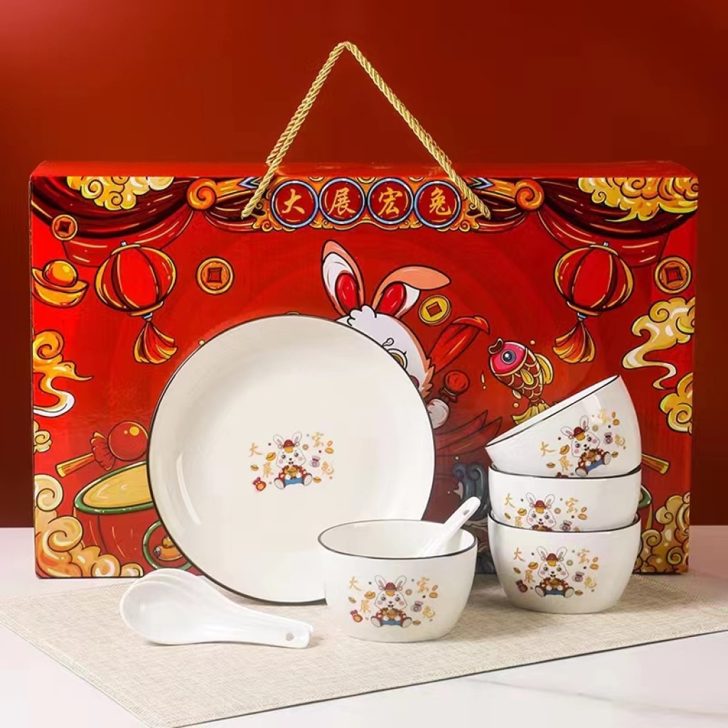 Tang Fan relief bone china tableware set gift ceramic ceramic bowl ceramic soup pot ceramic plate color box rice bowl