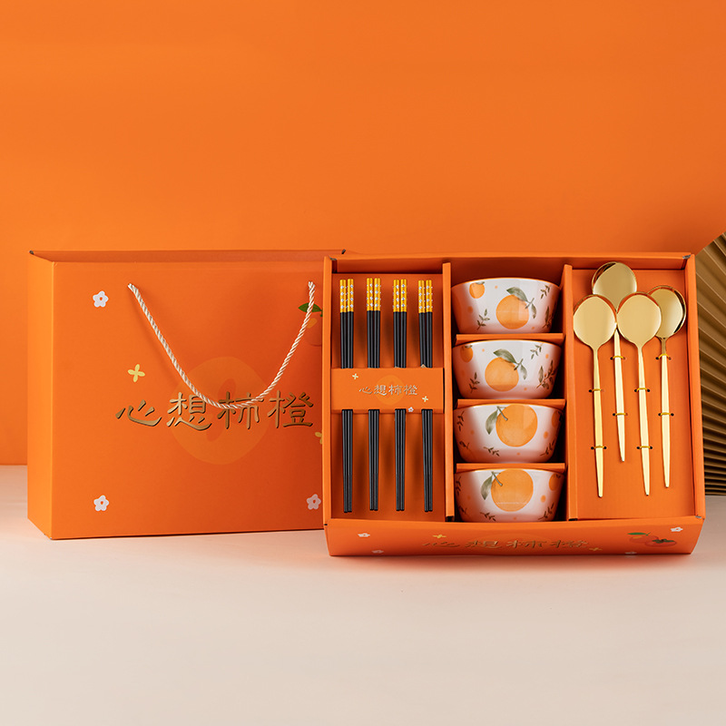 fine orange box camellia four bowls + alloy chopsticks