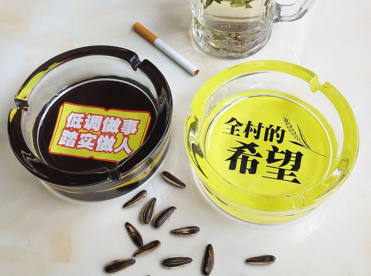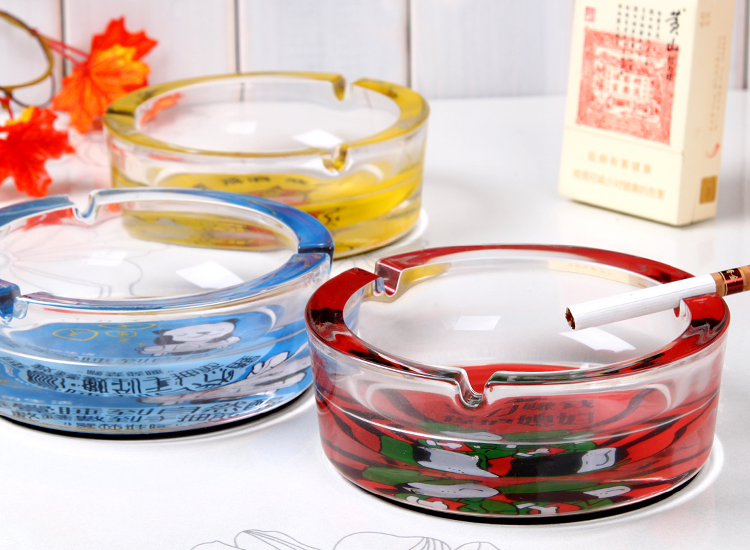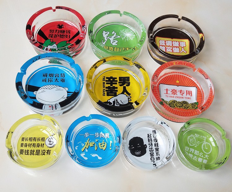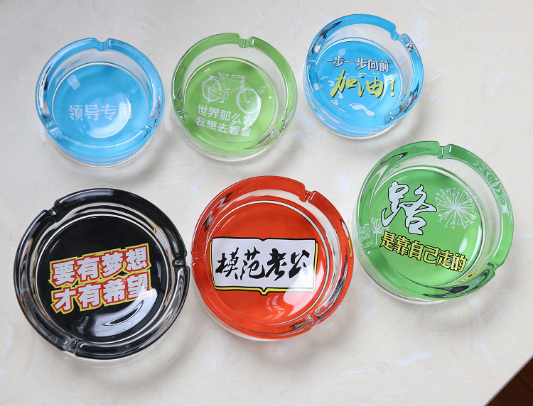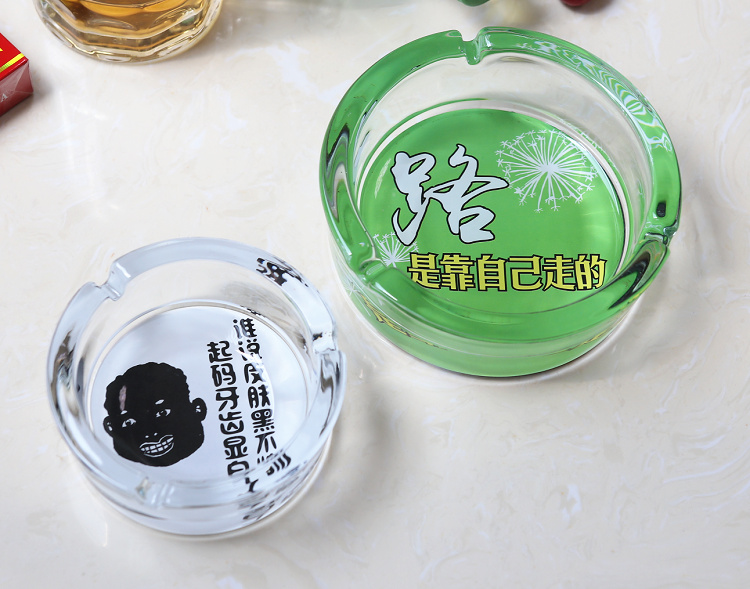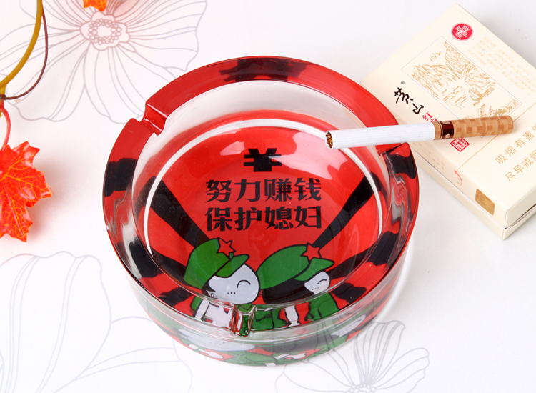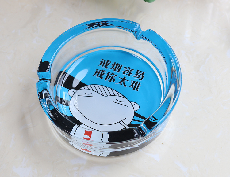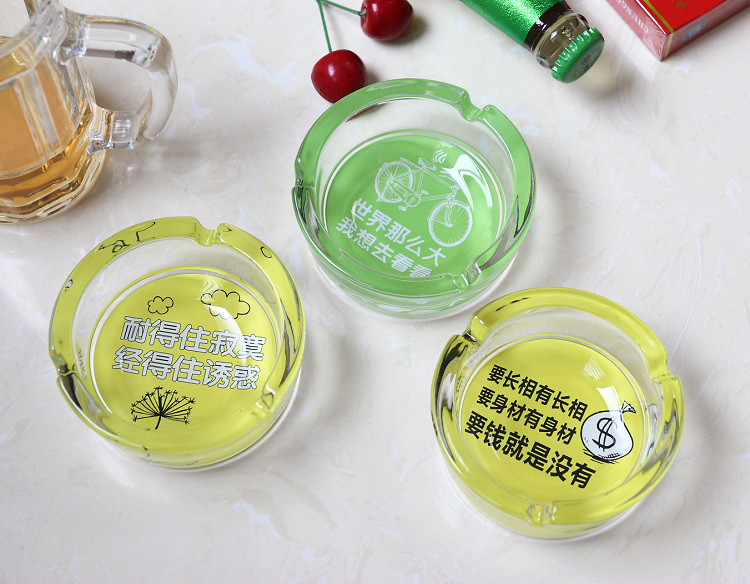 图案是印在烟灰缸反面底部的,正面抖烟灰是烫不坏。反面底部里面才是图案,边缘都是透明玻璃的。因正面拍摄反光太强