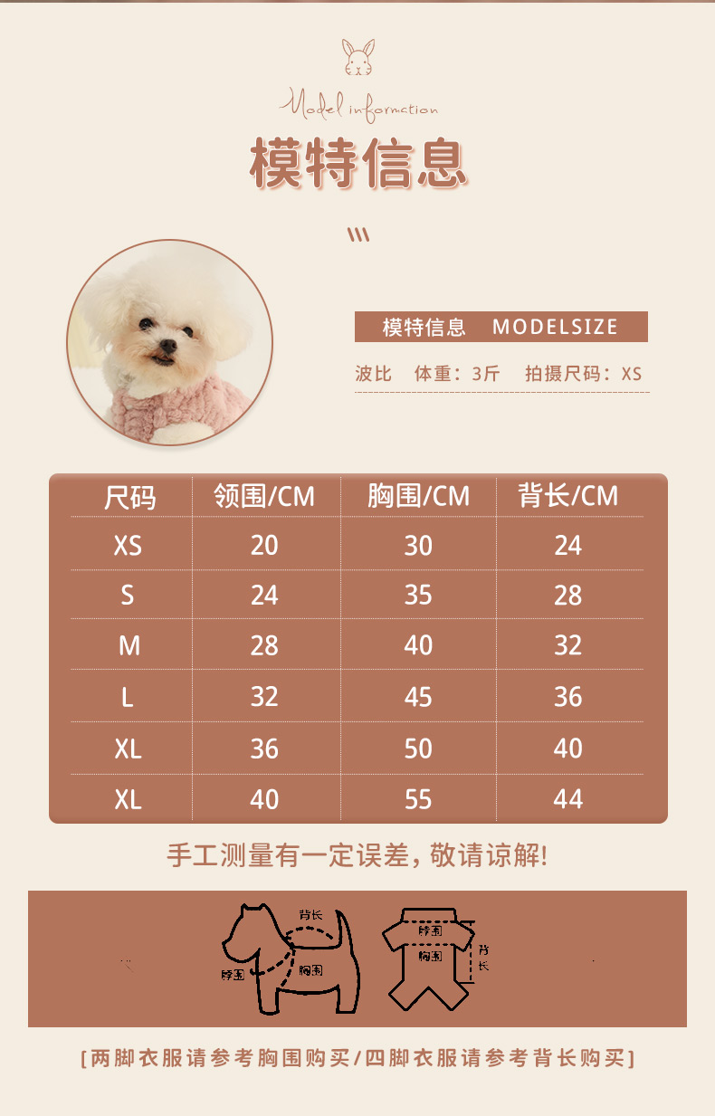 | S | 24 | 35 | 28 | 2. Four-legged clothing is mainly determined by back length. |