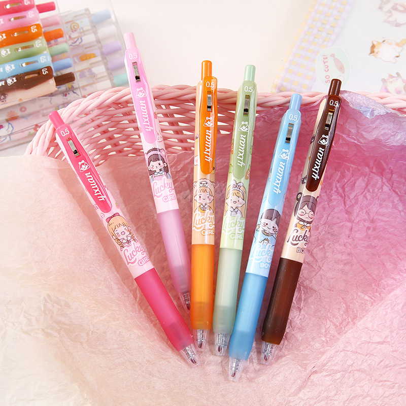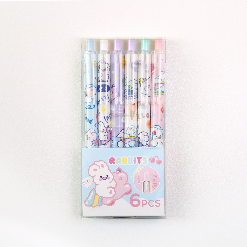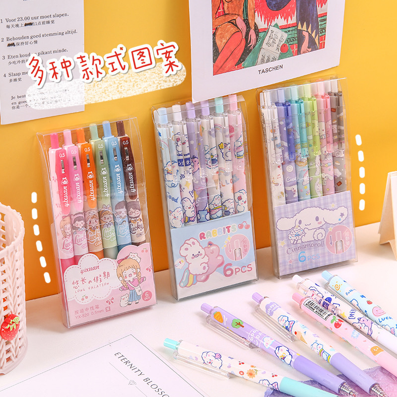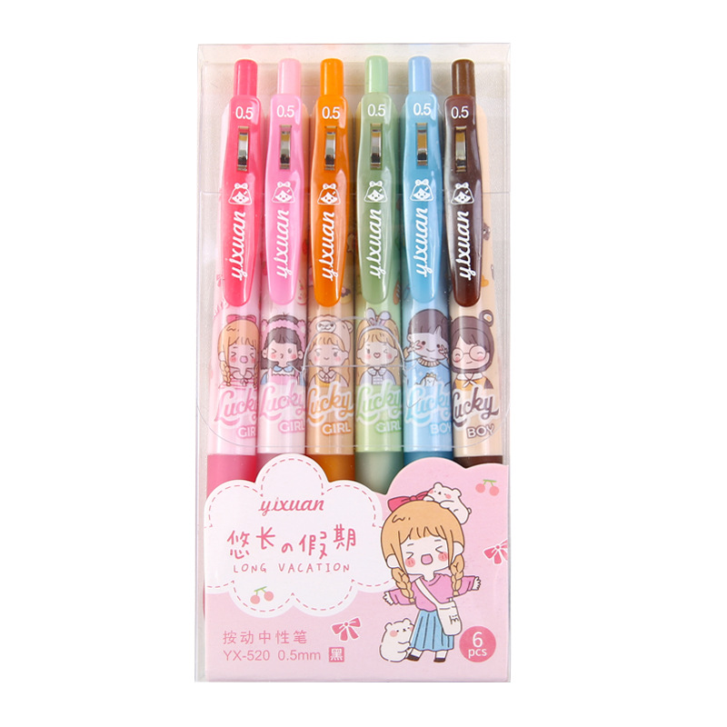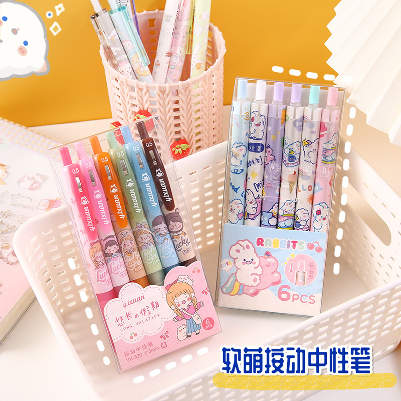 Cute Ins Girl Heart Press Gel Pen Cartoon Student Push Type Ball Pen Office Signature Pen Black 6 Boxed 中文版