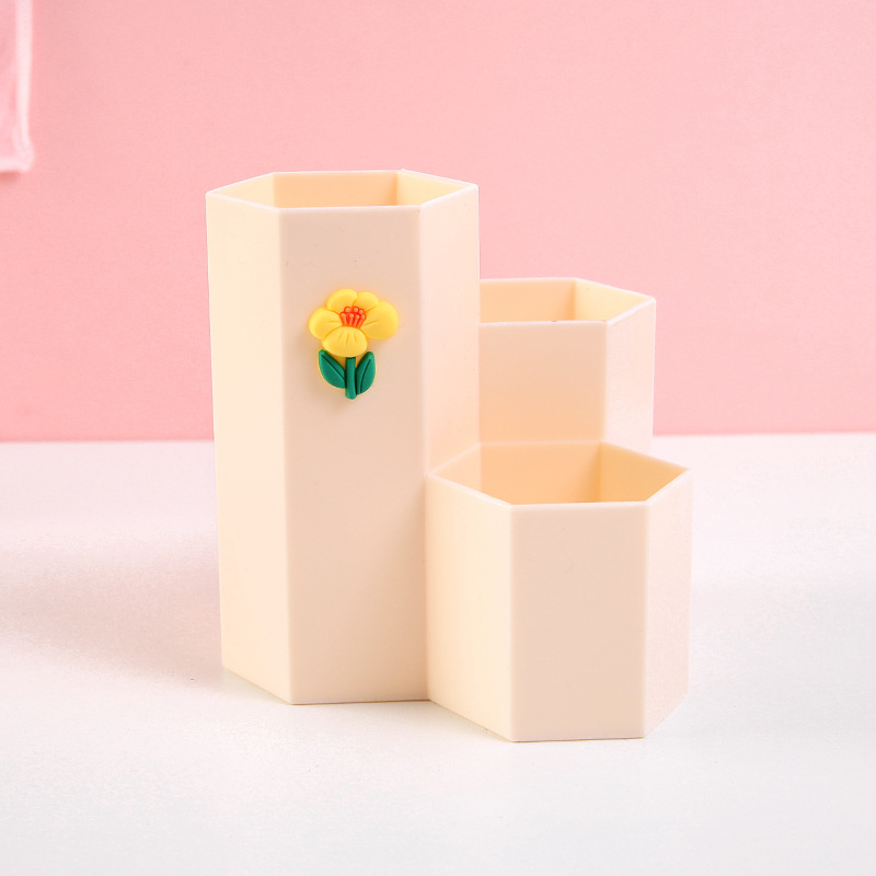 Korean-Style Cartoon Desktop Storage Pen Holder Multi-Functional Student Hexagonal Stationery Storage Container Cute Three-Grid Storage Box