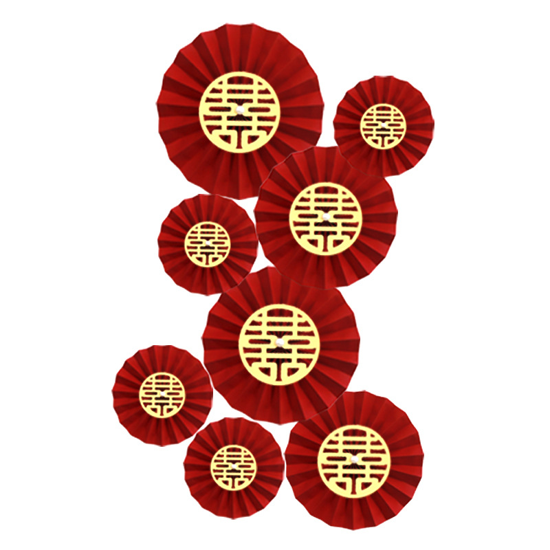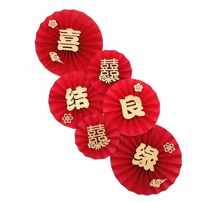 6-piece wine red round xi pearl paper fan flower