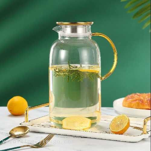 A glass of drink, high borosilicate glass material, slender body, smooth exterior wall easy to clean, beautiful and practical; PP + stainless steel lid, healthy and fashionable; Yellow anti-scalding large and wide handle, fashionable and beautiful, easy to hold; Large capacity of the body, meet the summer drinking water needs.
