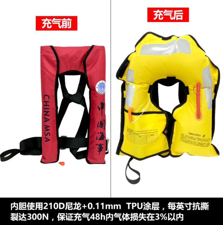 Air-inflated lifejackets are made of high-strength anti-tear TPU composite fabric. They are equipped with micro-high pressure gas cylinders and inflatable valves. They are manufactured using high-frequency mold heating technology, and the garments comply with the SOLAS Convention and the latest IMO standards. They have been certified by "CCS" and are allowed to be used in various fields such as maritime, naval vessels, maritime anti-smuggling, water construction, water sports, salvage operations, navigation, flood control, and flood prevention. The main features are: compact and lightweight, comfortable and convenient to wear; the lifejackets inflate quickly when submerged, automatically supporting the body to face the sky, rising 120mm above the water surface, with large buoyancy and good airtightness. The buoyancy will decrease by less than 5% within 24 hours, and all technical performance standards are met. Currently, they have been recognized by the maritime industry and are the latest version of traditional foam lifejackets.