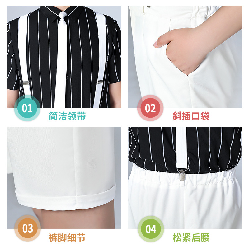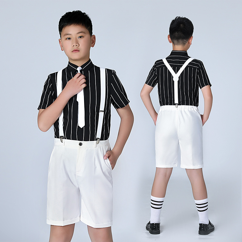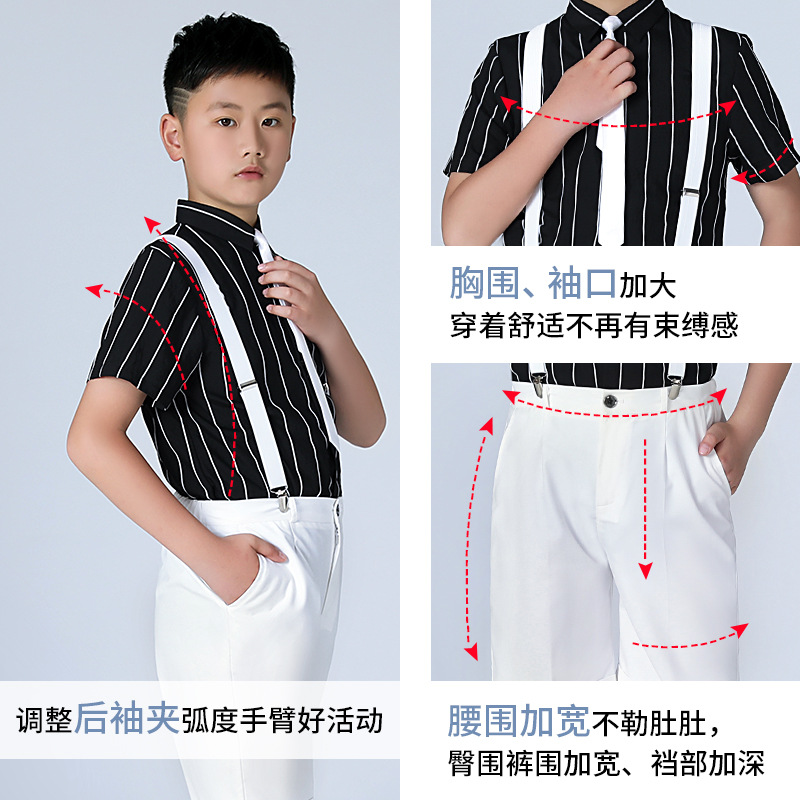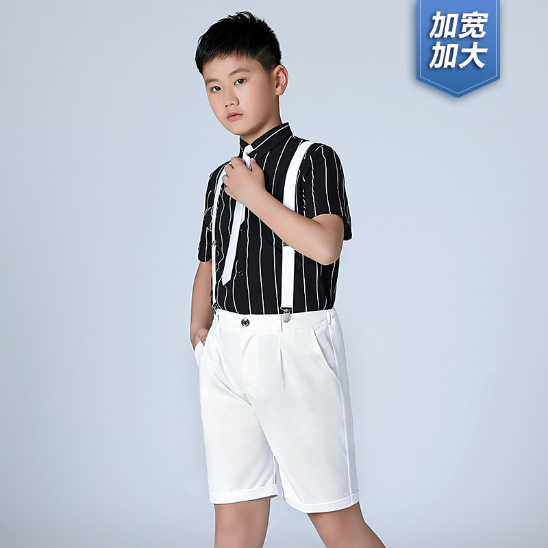 Boy's Suit Summer New Short Sleeve Striped Suspender Pants Suit Wholesale Fat Version Children Host Costume plus-Sized 中文版