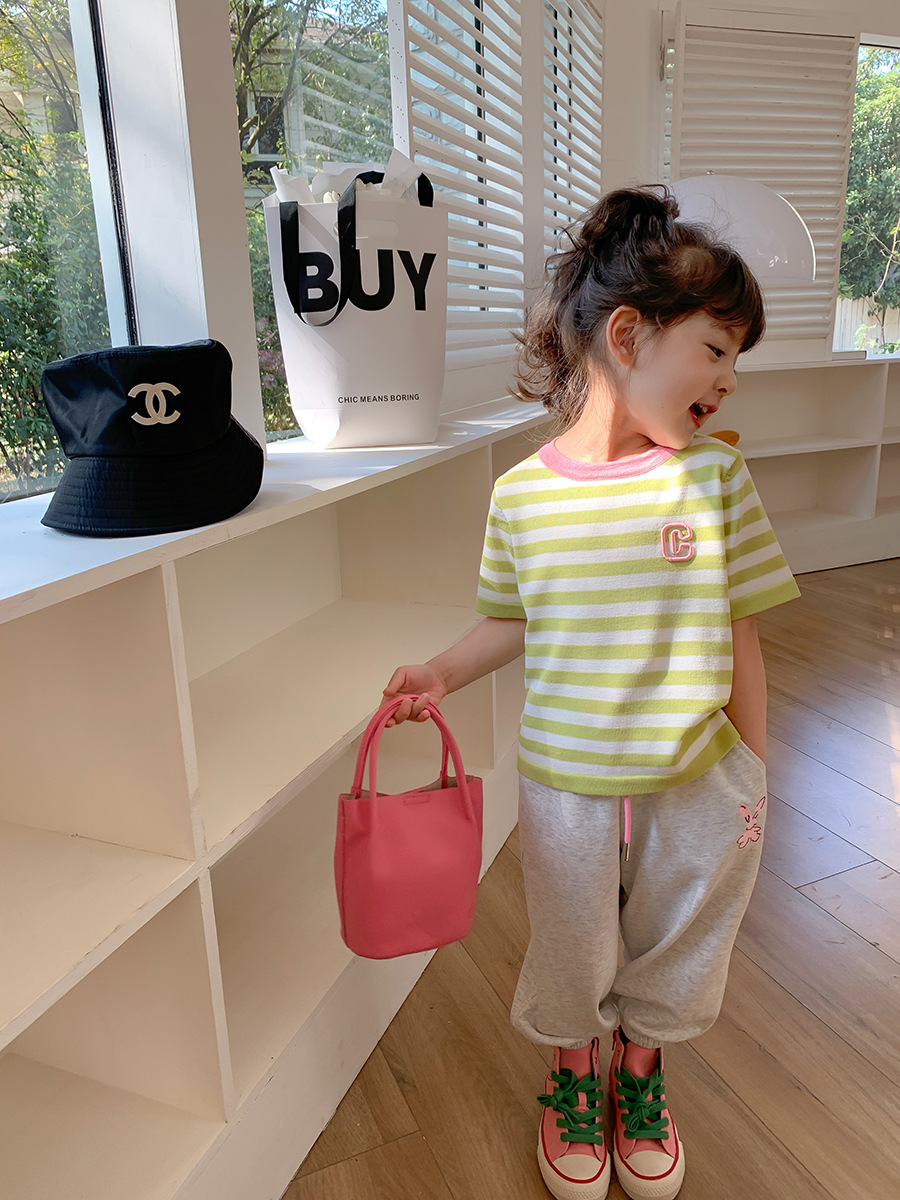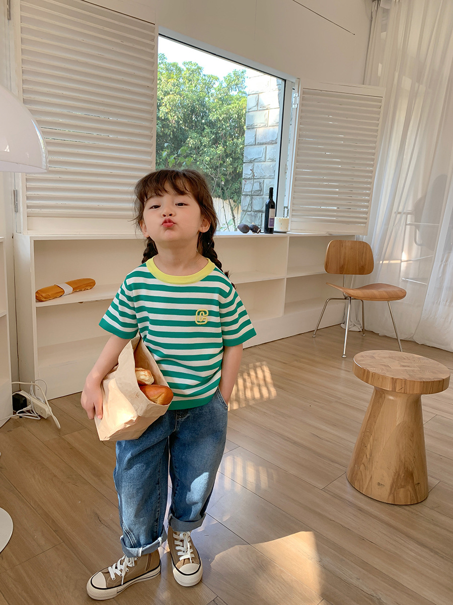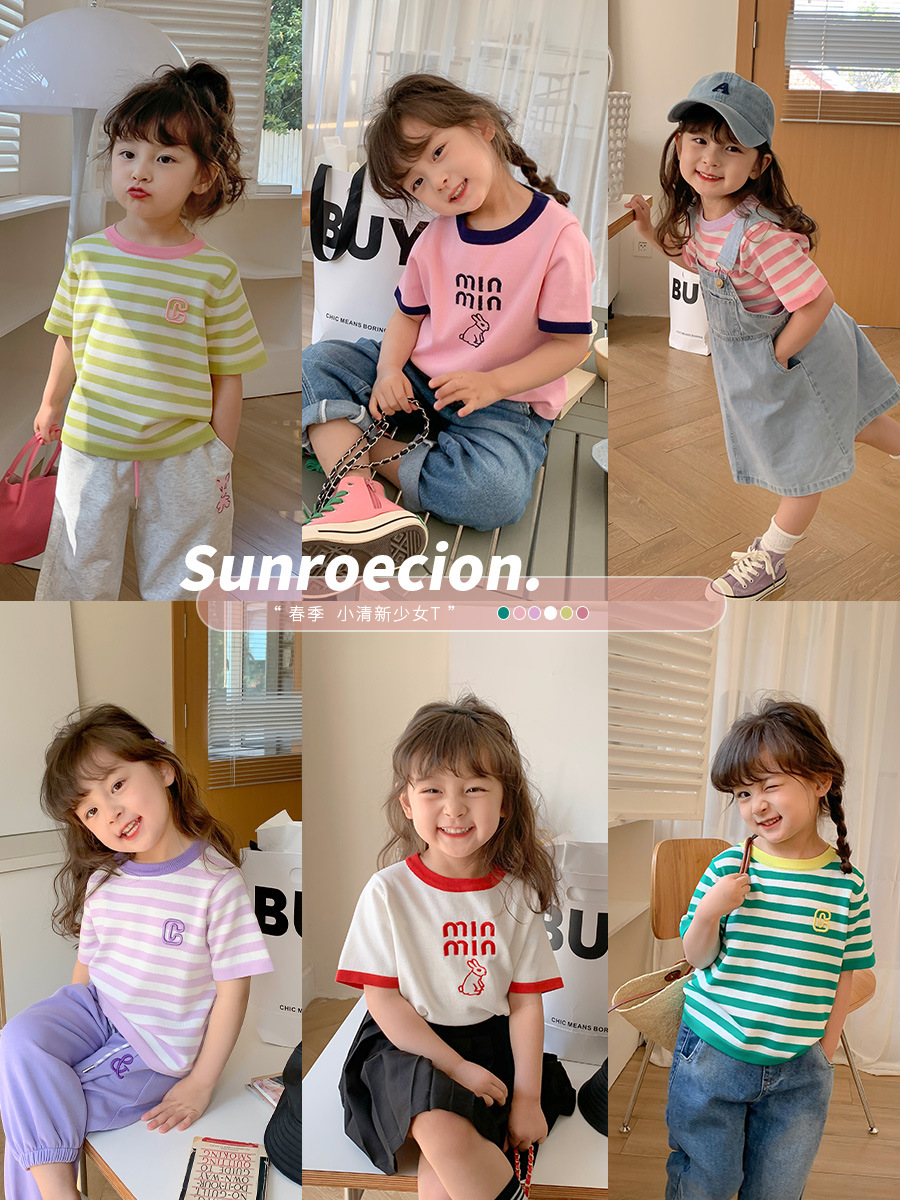 2023 Spring New Girls' Short-Sleeved T-shirt Mixed Color Stripe Children's T-shirt Short-Sleeved Korean Style Fashion Baby T-shirt 中文版