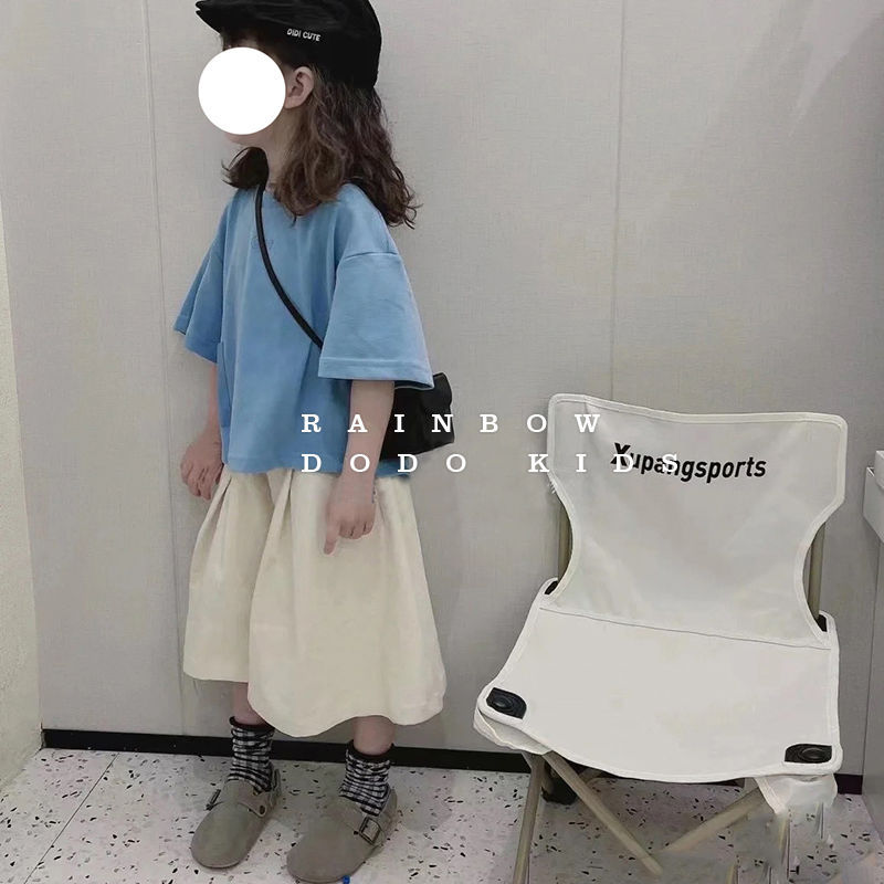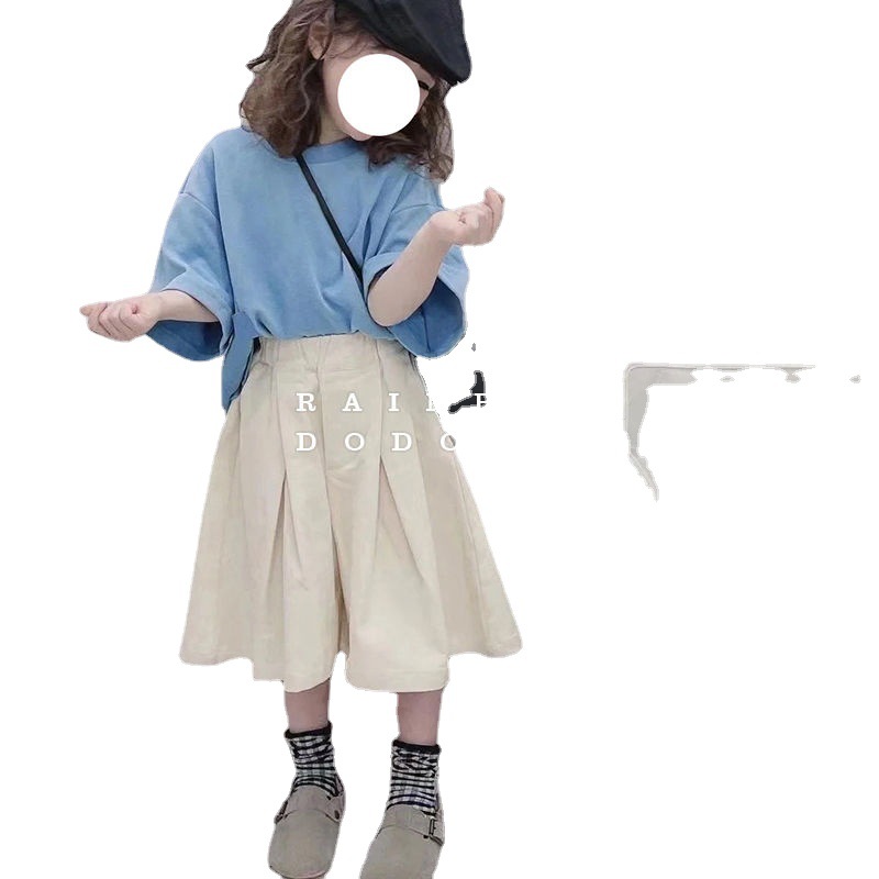 Korean Children's Clothing 2022 Summer New Girls' Solid Color Loose T-shirt Wide Leg Cropped Pants Thin Korean Style Leisure Suit 中文版