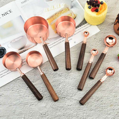 Stainless Steel Measuring Cup Measuring Spoon 8-Piece Set Baking Utensils with Scale Measuring Spoon Measuring Spoon Walnut Wooden Handle Rose Gold Measuring Spoon 中文版