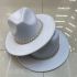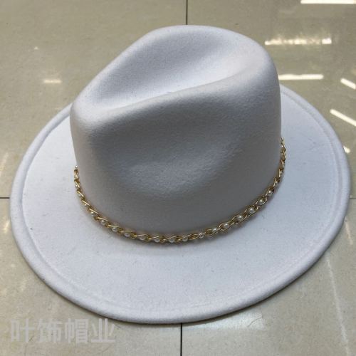 One-piece, single-sided wool blend Panama-style cowboy hat with a 7CM brim, 57CM head circumference, and metal bead chain decoration. The inner band is adjustable. The fabric comes in 47 colors to choose from.