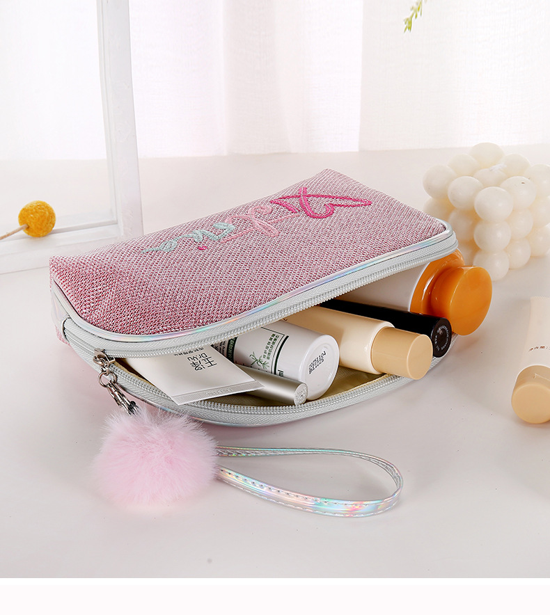 Korean Style Fur Ball Cosmetic Bag Printed Logo Gold Powder Shell Wash Bag Semicircle Storage Bag Clutch Factory Straight