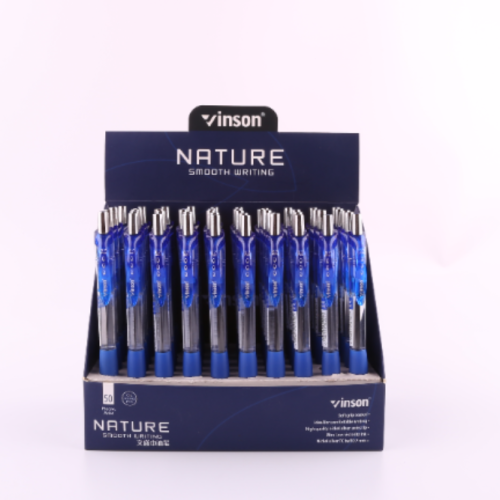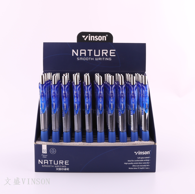 Wensheng's press-activated ballpoint pen, writing is smooth and fluid, with bright ink colors. Available in blue, red, and black, the pen comes in a clear display box.