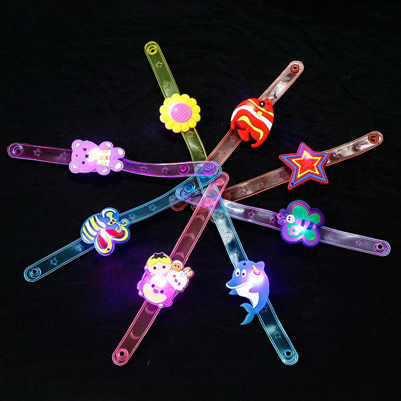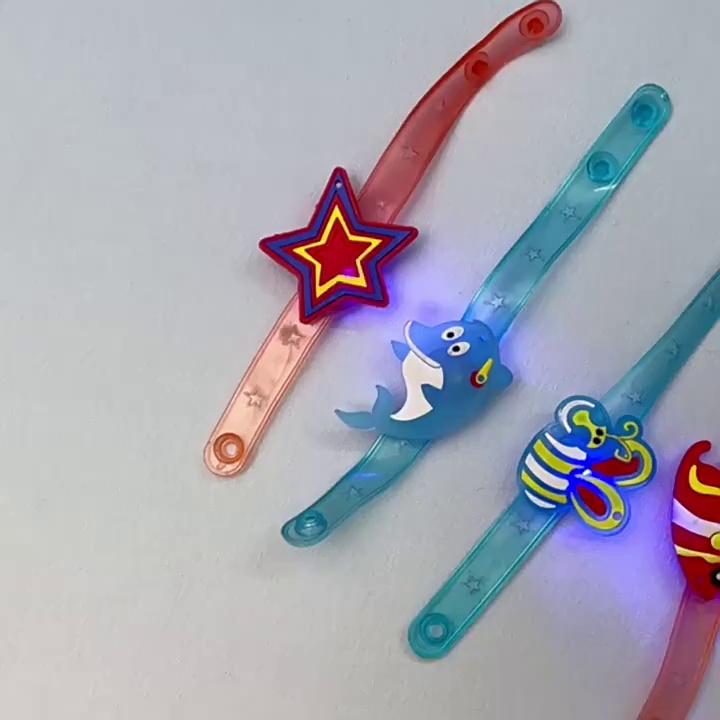 Launch a variety of patterns and colors of flash cartoon wristbands. At birthday parties and dances, when the lights are dim, press the button behind the wristband, and it can flash red, blue, and yellow light. Wearing it on your wrist, you can shine and make your debut, suitable for girls' parties, and it is the focus of the party. There are a variety of styles, and the distribution is random (not selected).
