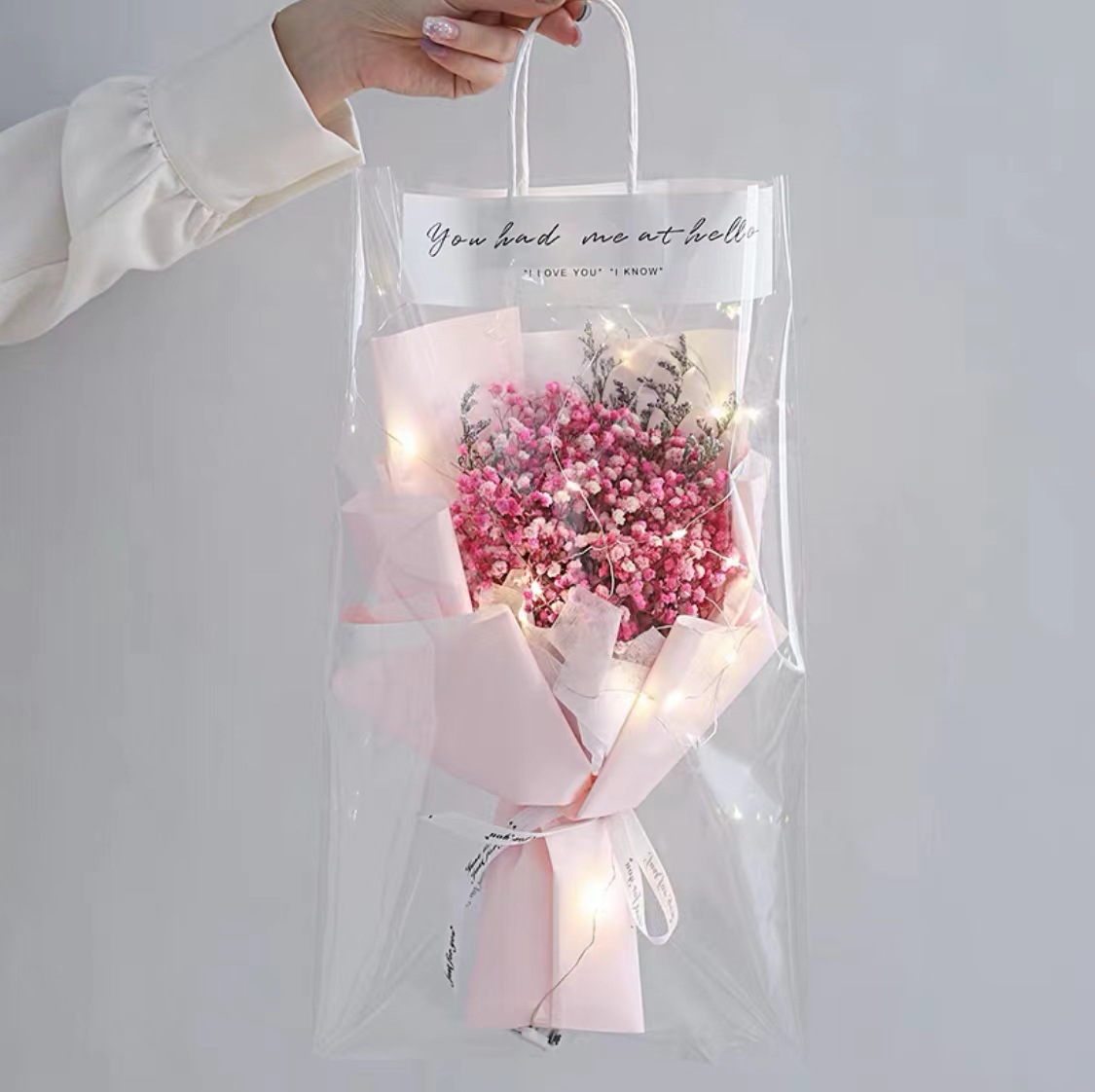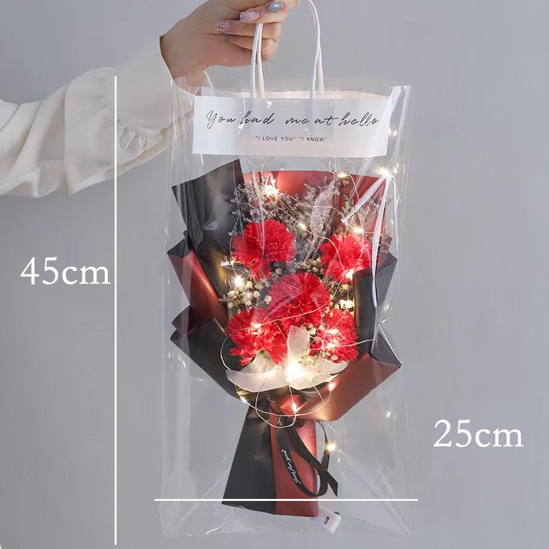 pink carnation bouquet + led light + transparent bag