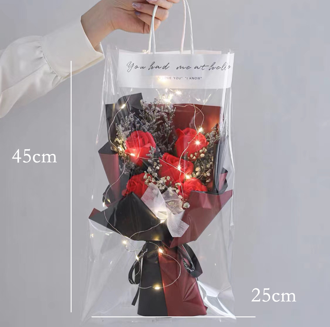 red rose-bouquet + led light + transparent bag