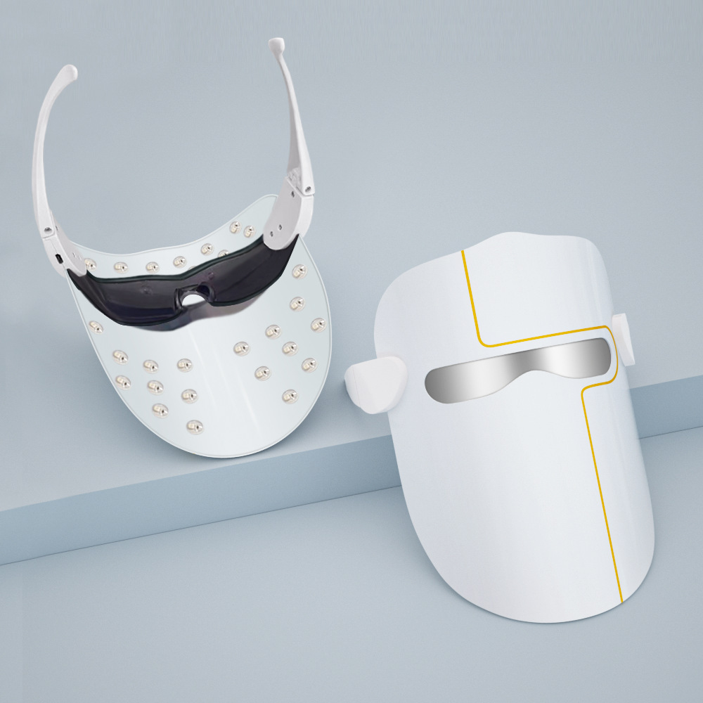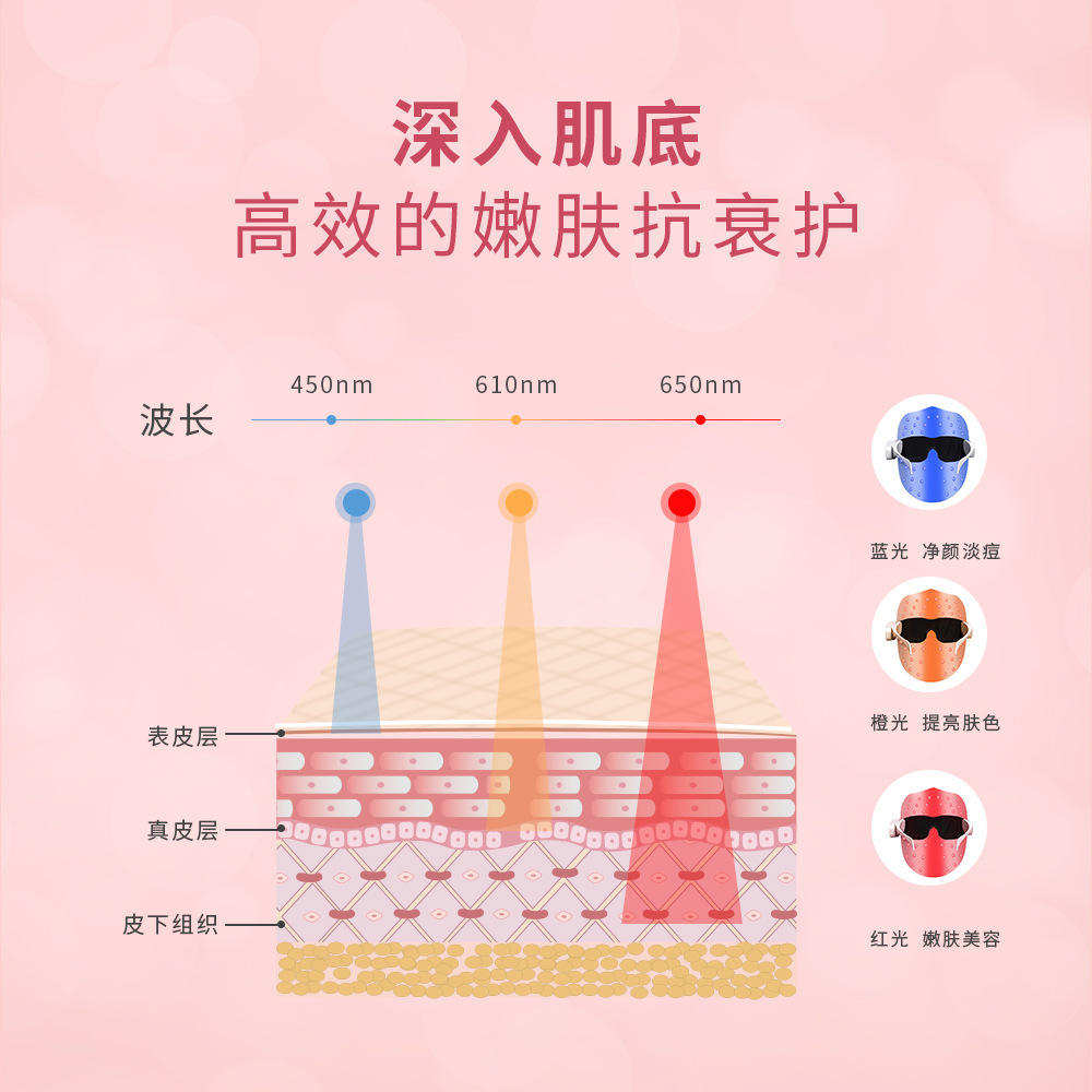 LED beauty mask triple spectrum technology, red light lightens wrinkles (skin vitality), orange light whitens skin (elastic care), blue light Net bacteria light acne (calm).