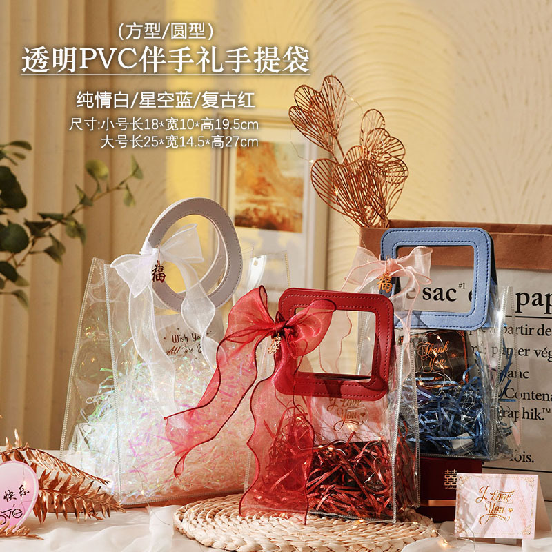 transparent pvc gift bag-red square handle-large bag