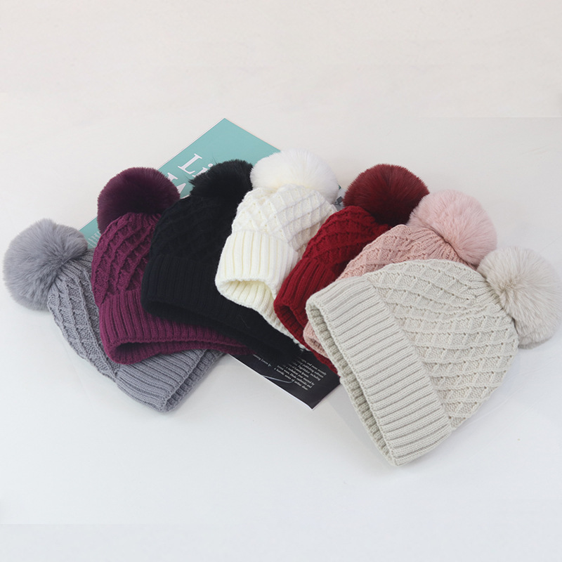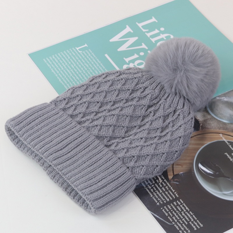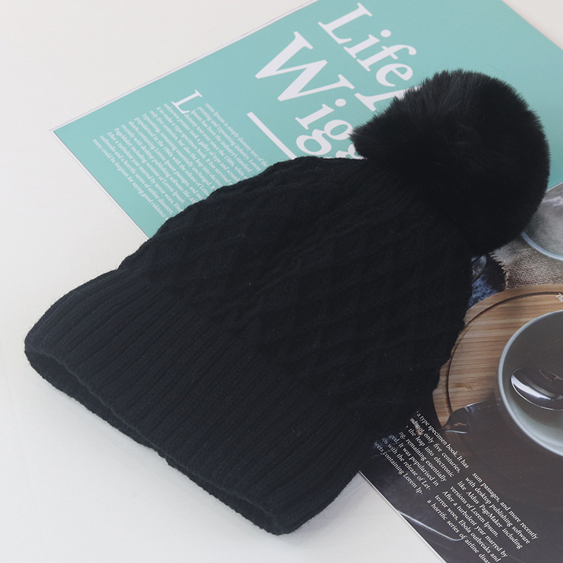 trendy korean-style thickened fleece-lined ear protection horizontal pattern fur ball knitted hat women's autumn and winter all-match fur ball warm wool hat