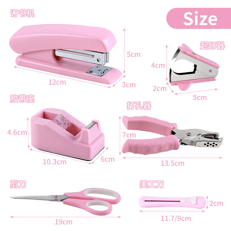 Small Order Custom Cross-Border Wholesale Pink Office Stationery Set Multi-Functional Binding Combination Stapler Scissors Notebook 中文版