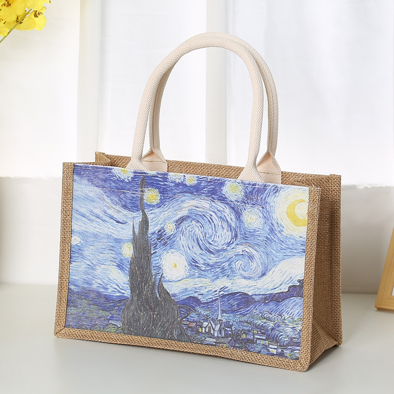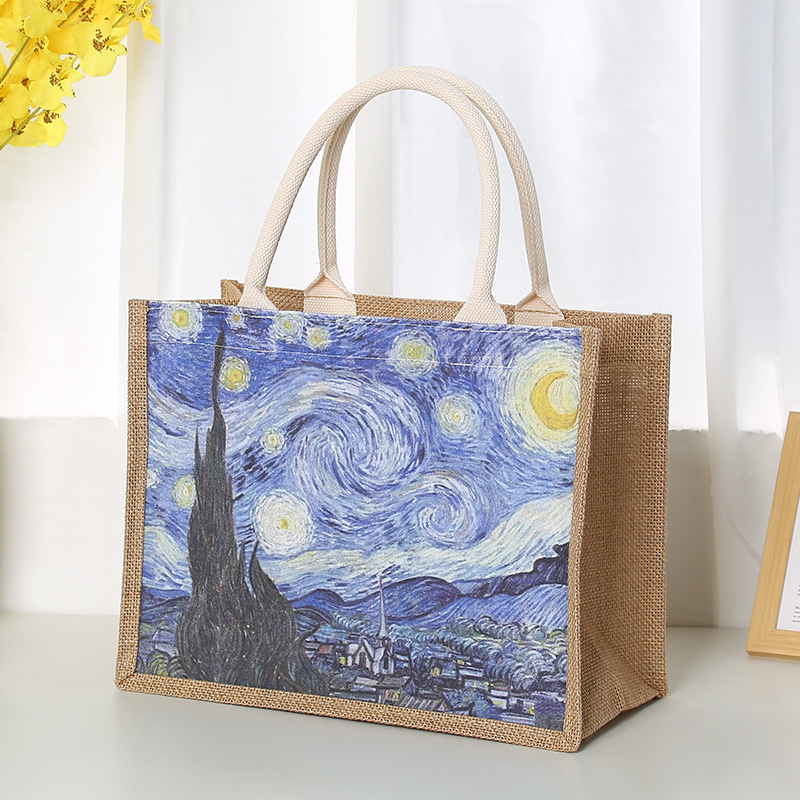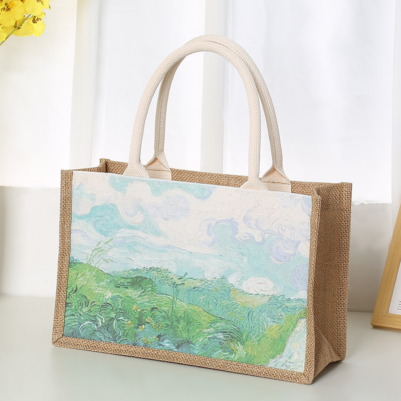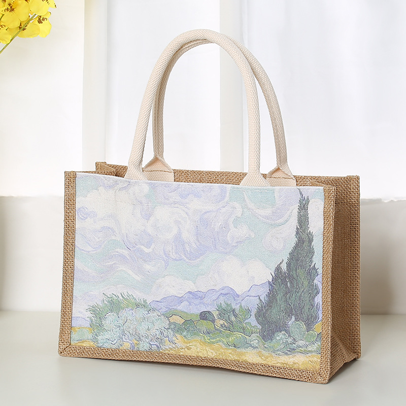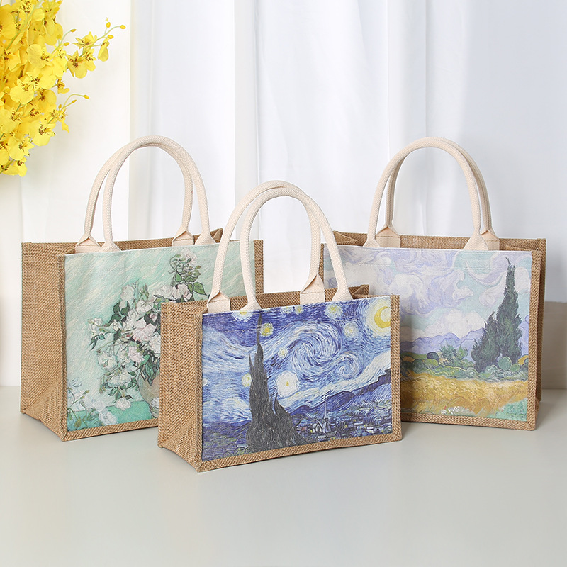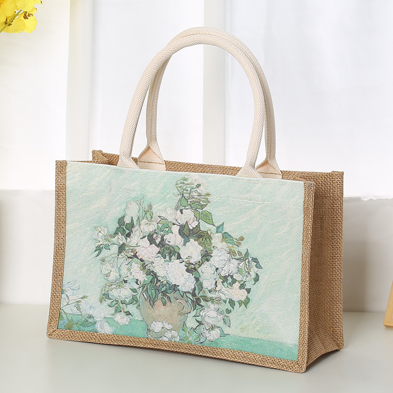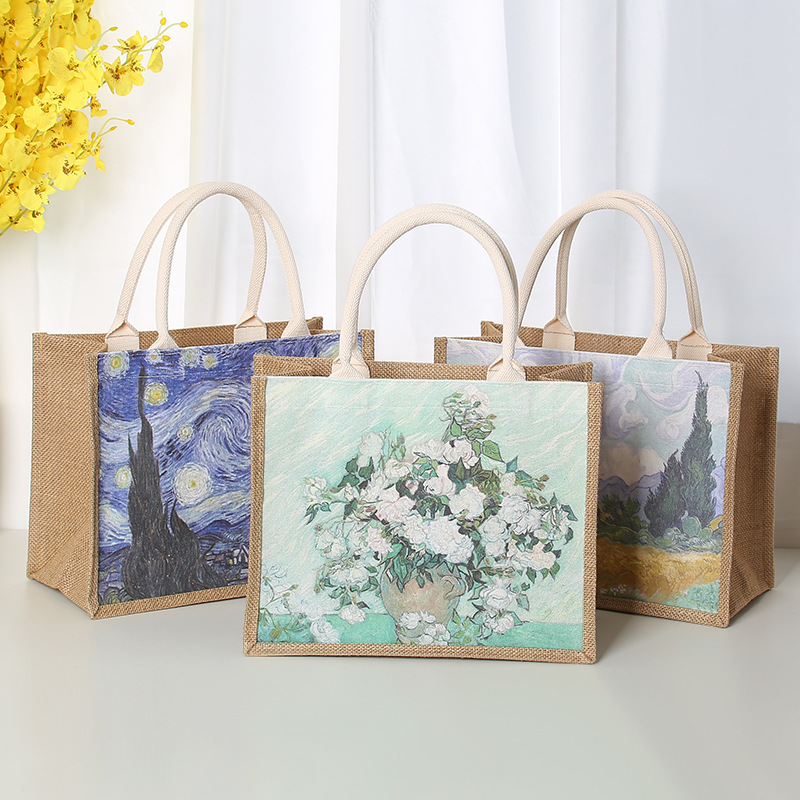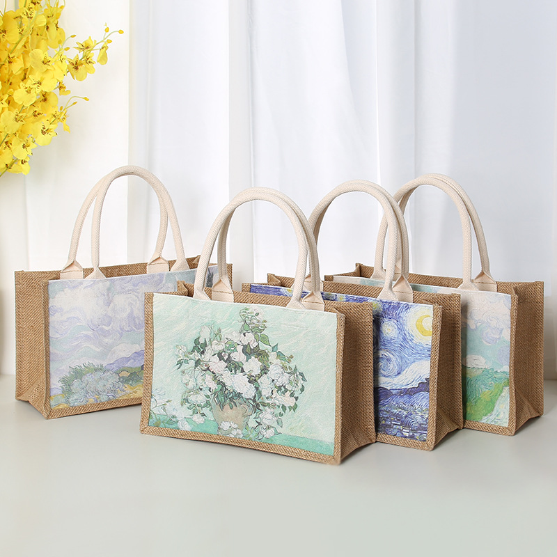 In Stock Wholesale Burlap Handbag Waterproof Printed Canvas Bag Gift Shopping Asian Cotton Linen Gunnysack