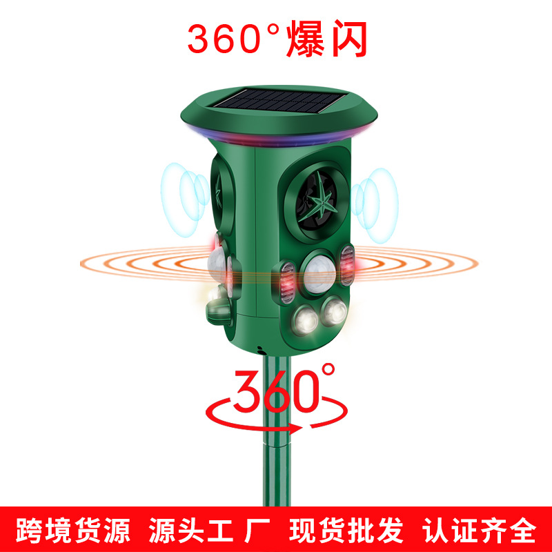 Solar-powered outdoor repellent for birds, dogs, mice, and snakes, using infrared and ultrasonic technology