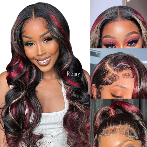 Skunk Stripe Glueless Wigs Black Red Blonde Highlights Body Wave Wig Human Hair