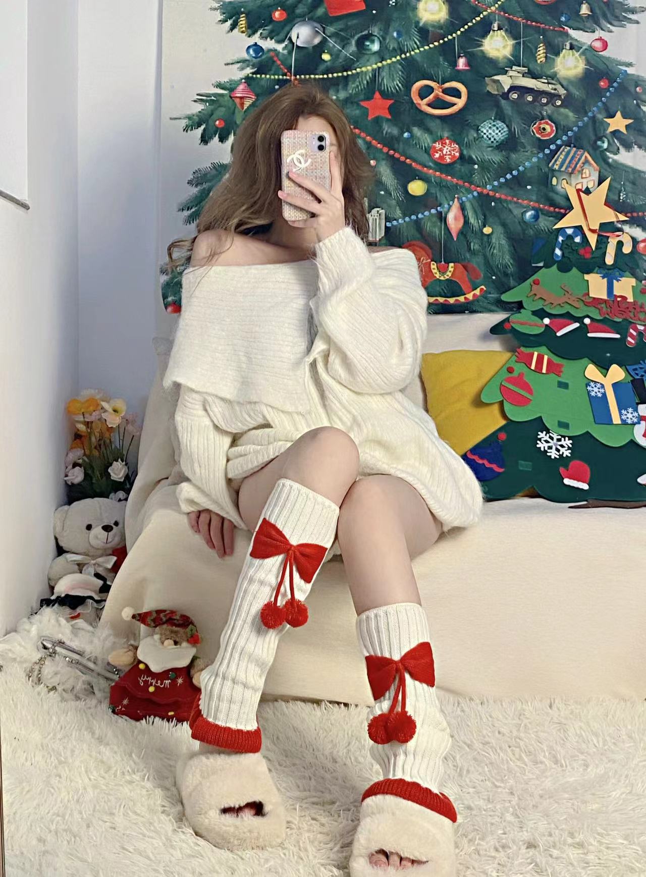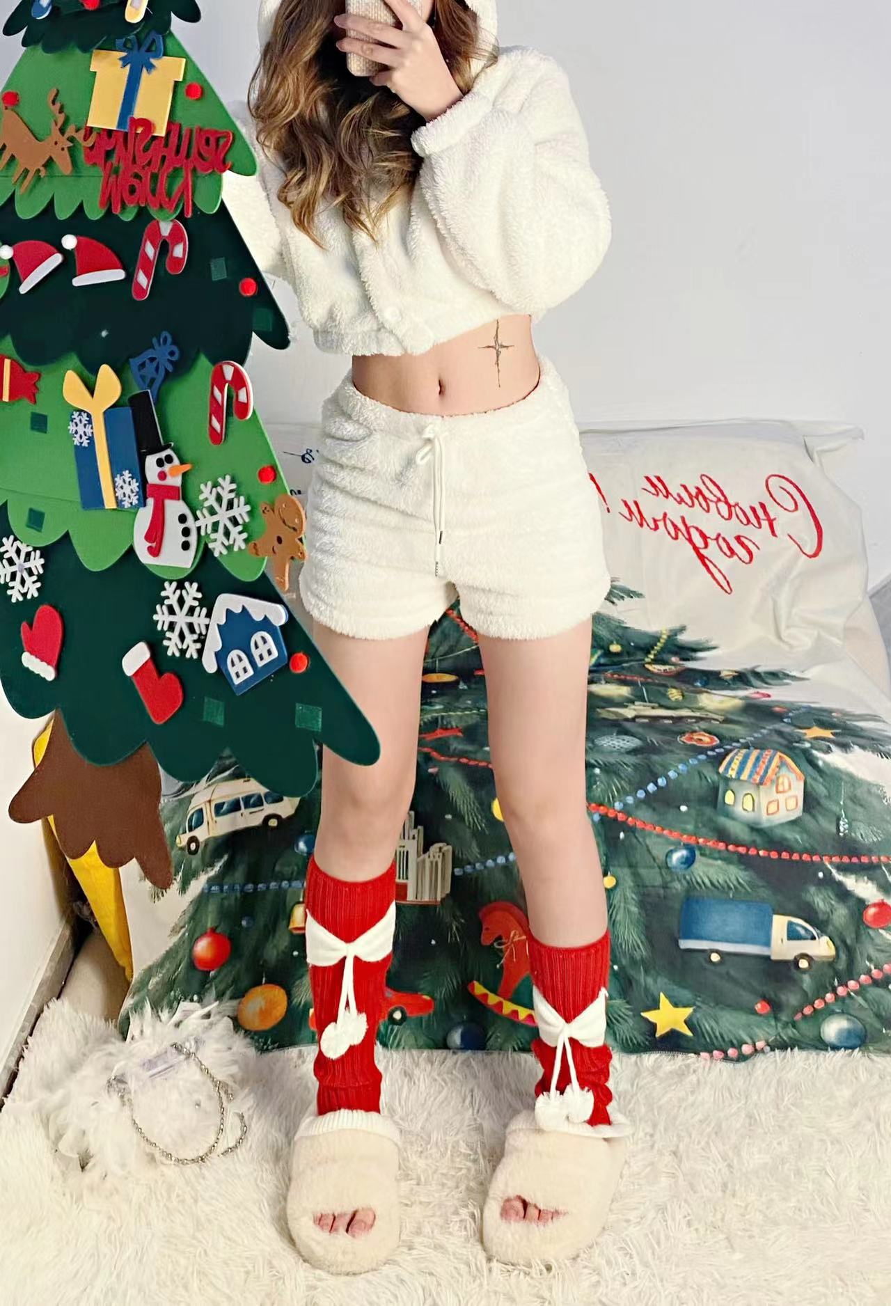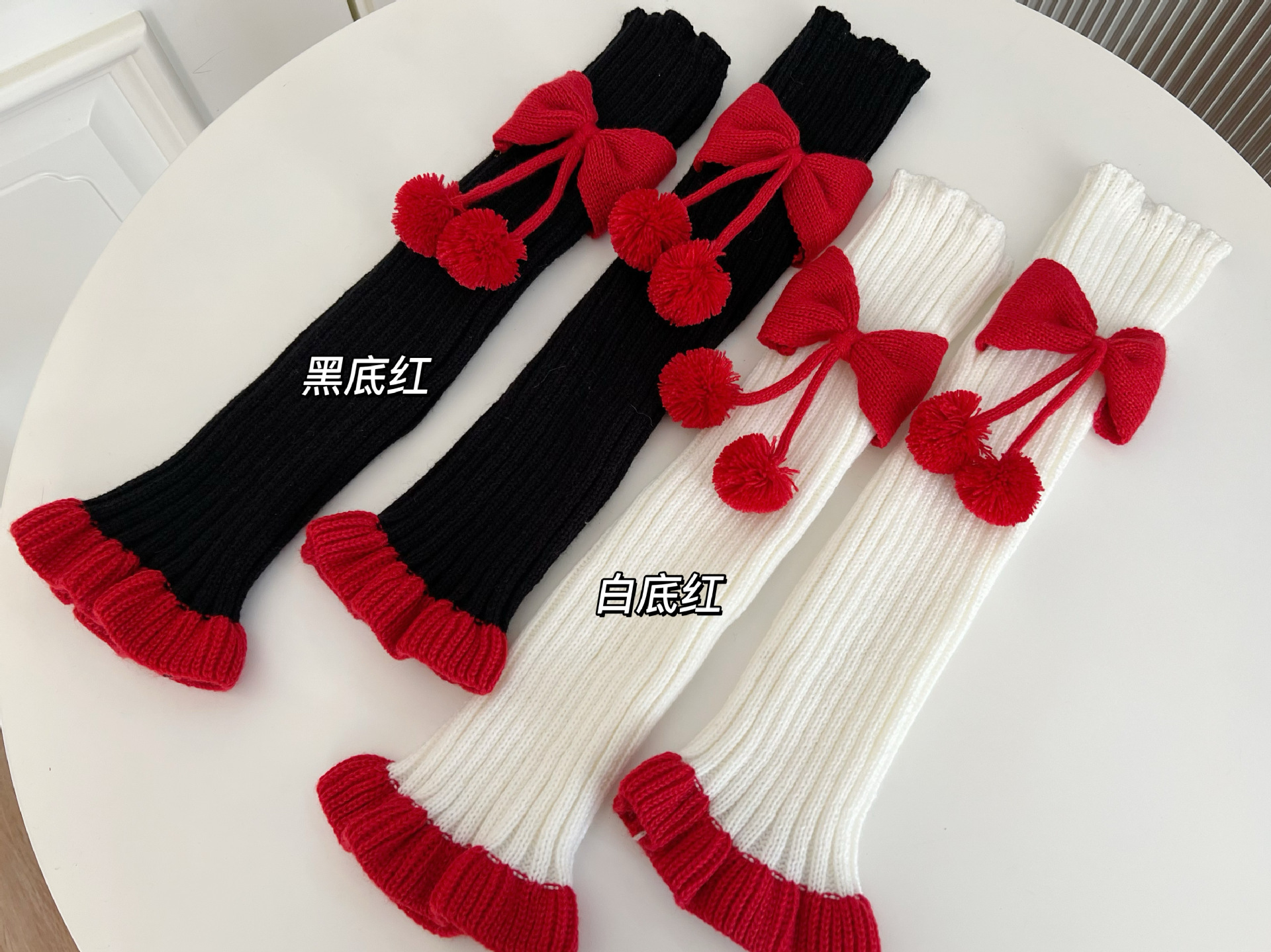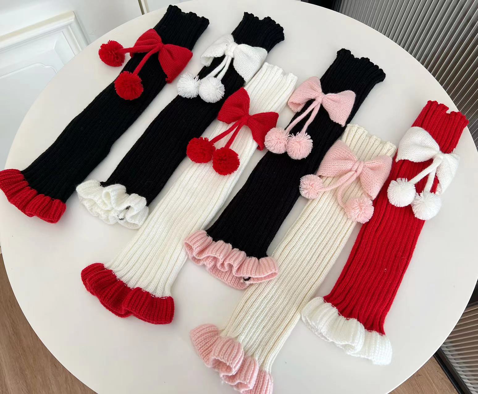 Chinese Red New Year Socks Christmas Leg Warmer Cute Bow Girl Hairy Ball Lace Color Matching Knitted Warm Foot Sock