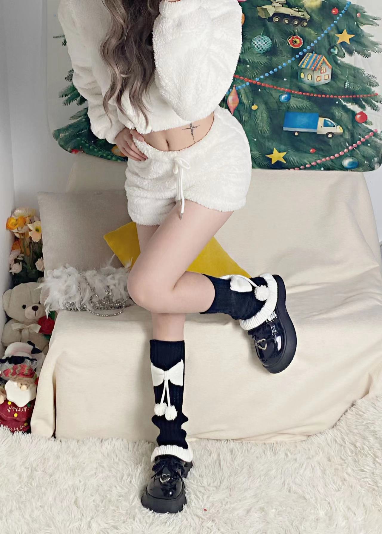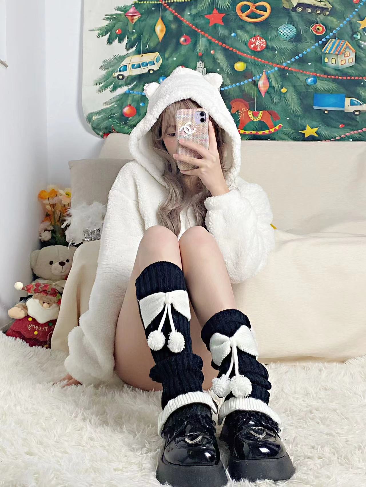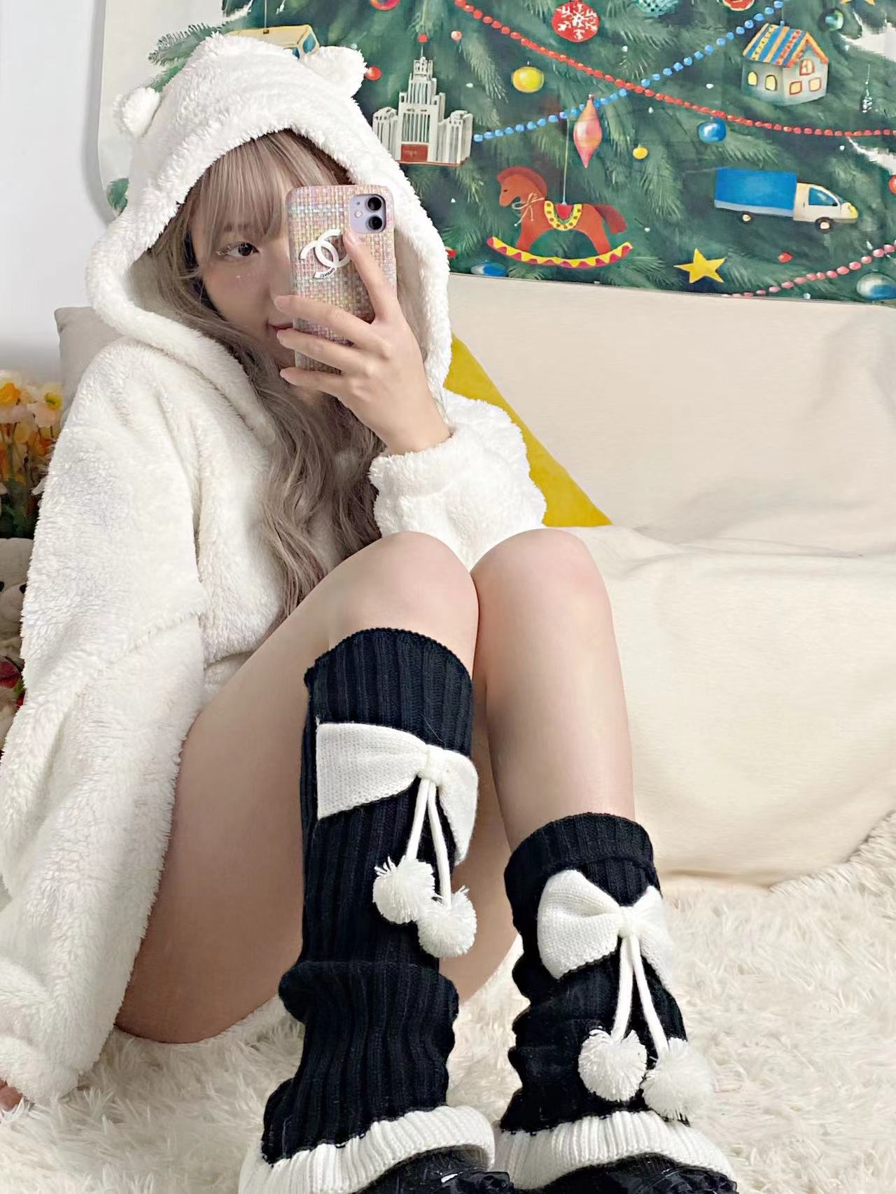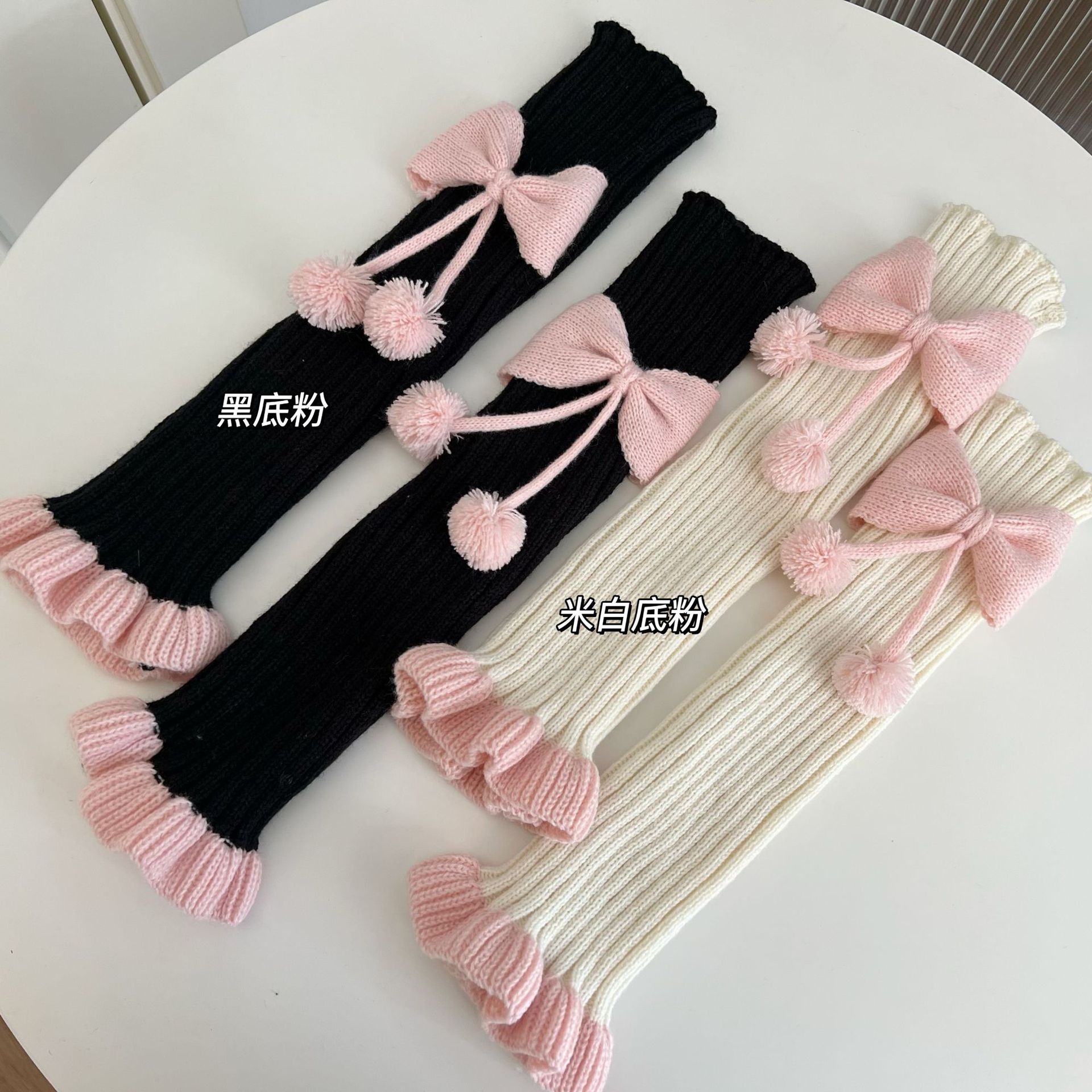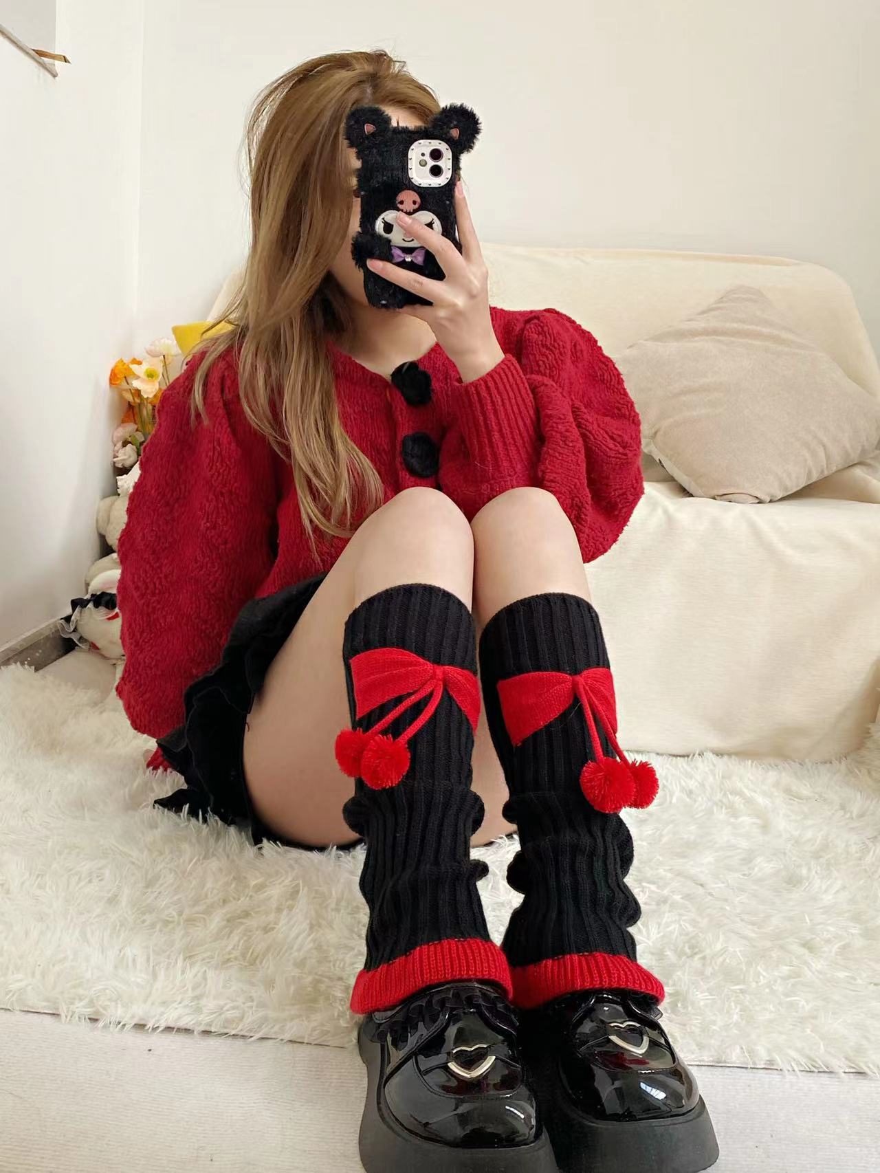 Chinese Red New Year Socks Christmas Leg Warmer Cute Bow Girl Hairy Ball Lace Color Matching Knitted Warm Foot Sock