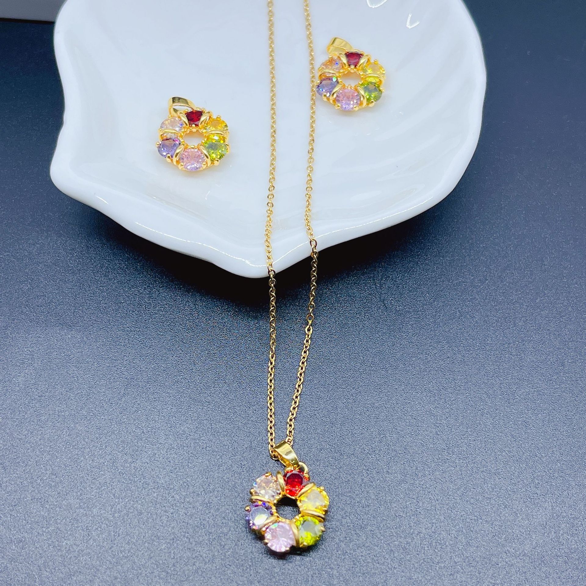 european and american style fashionable elegant high-grade shiny round flower zircon necklace female pendant light luxury necklace earring pendant 中文版