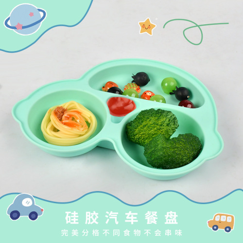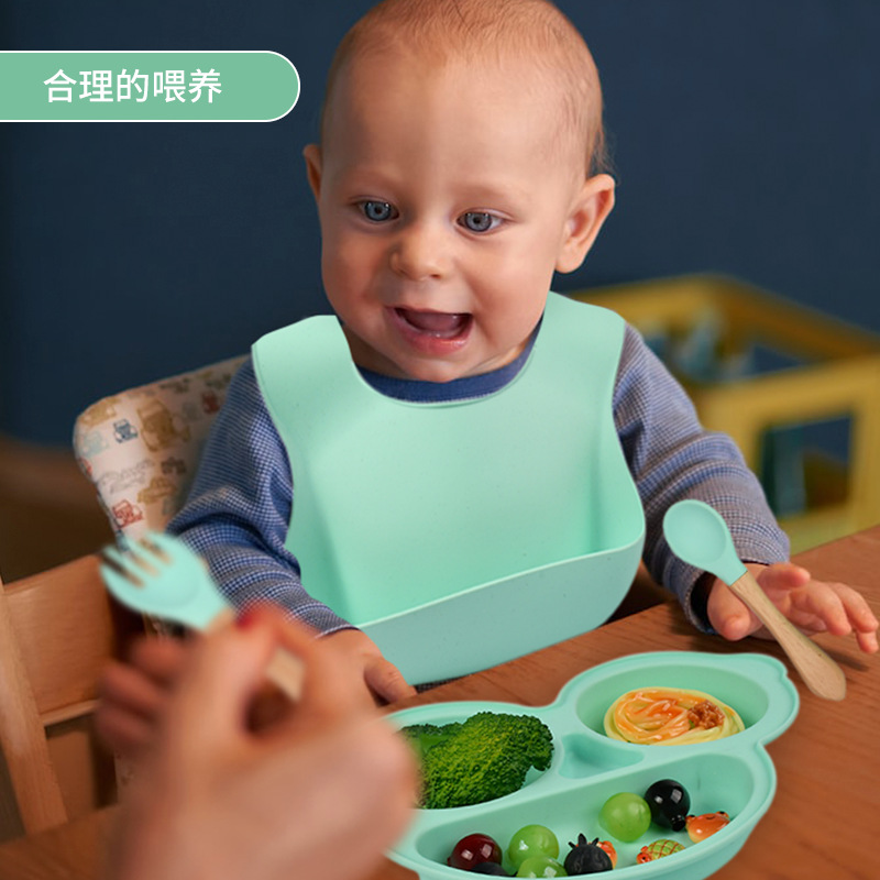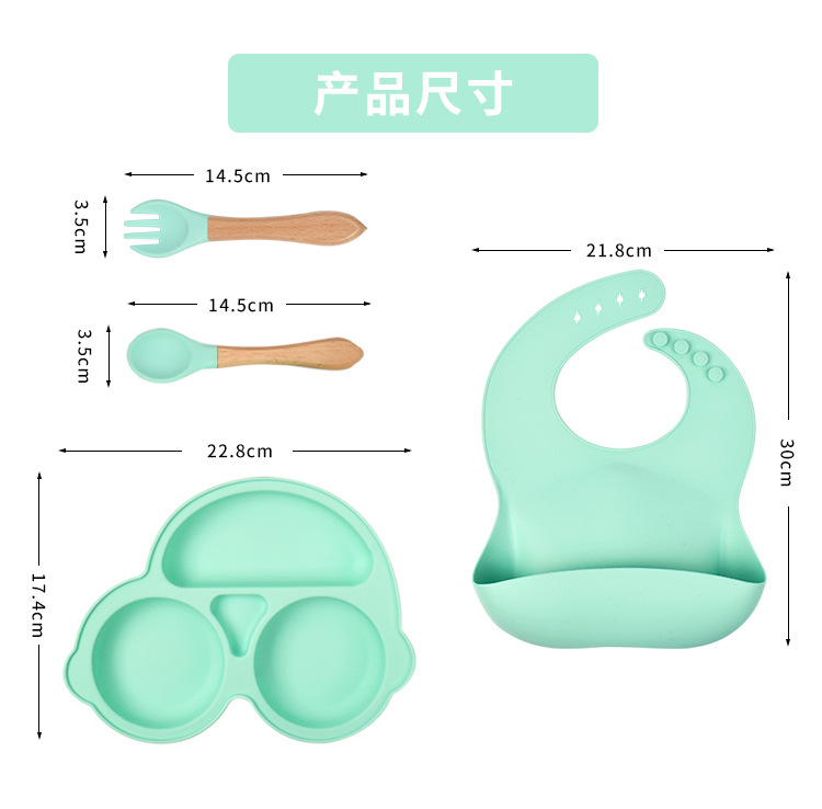 mint green car dinner plate four-piece set (bib * dinner plate * wooden handle spork) with aircraft box