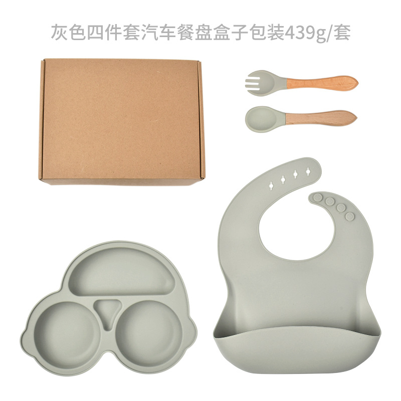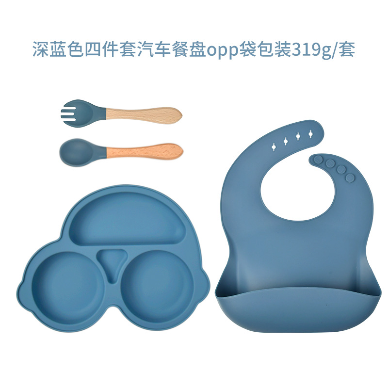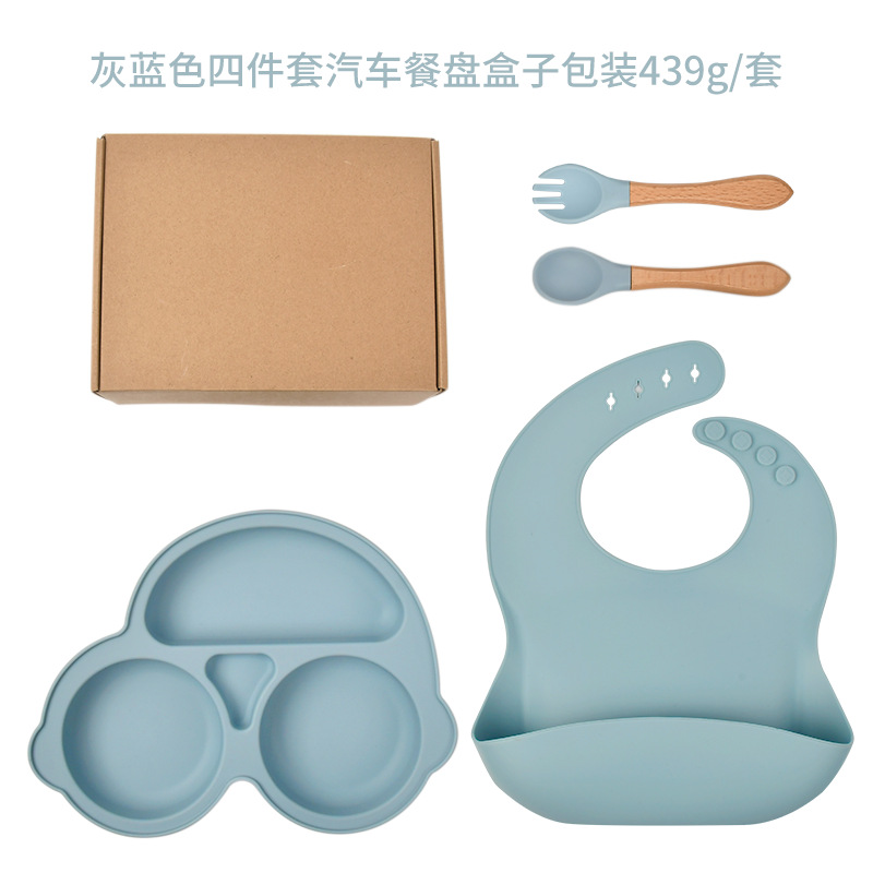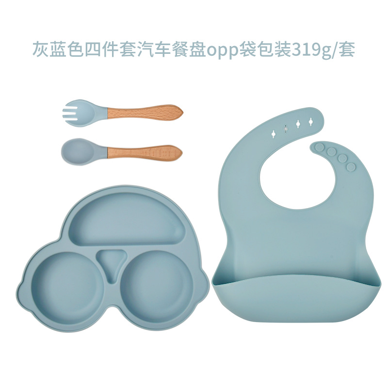 gray blue-four-piece car dinner plate (bib * dinner plate * wooden handle spork)