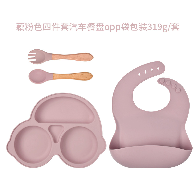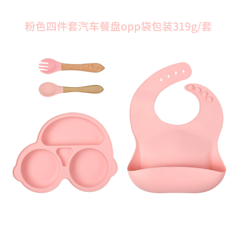 pink car dinner plate four-piece set (bib * dinner plate * wooden handle spork) with aircraft box