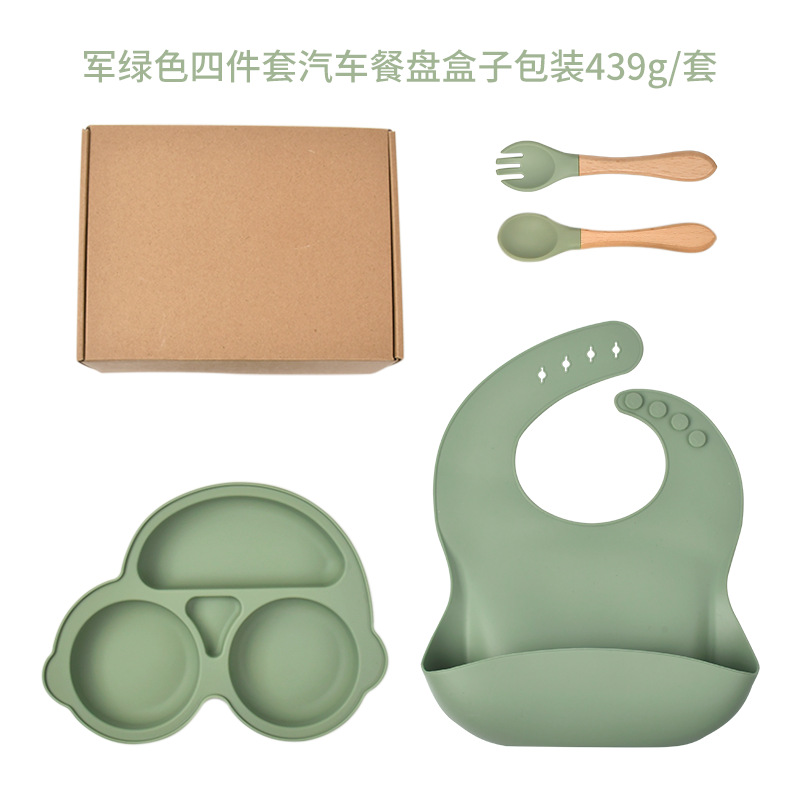 army green-car dinner plate four-piece set (bib * dinner plate * wooden handle spork) with aircraft box