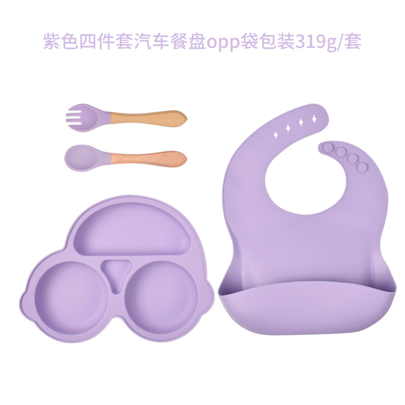 purple-four-piece car plate (bib * plate * wooden handle spork)