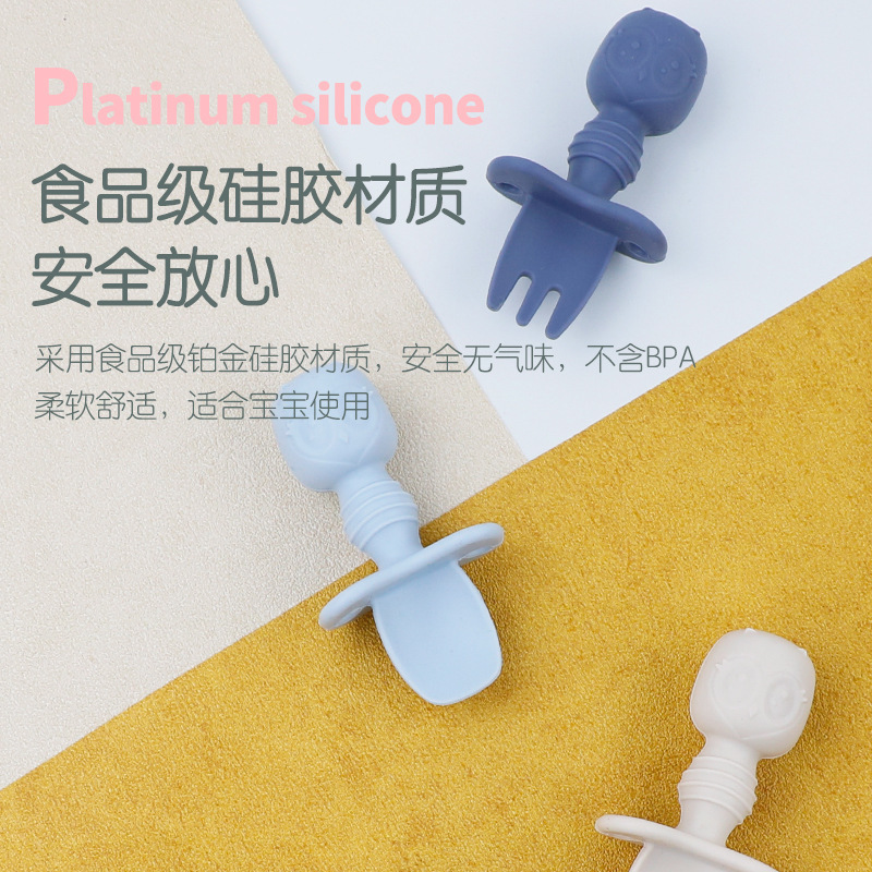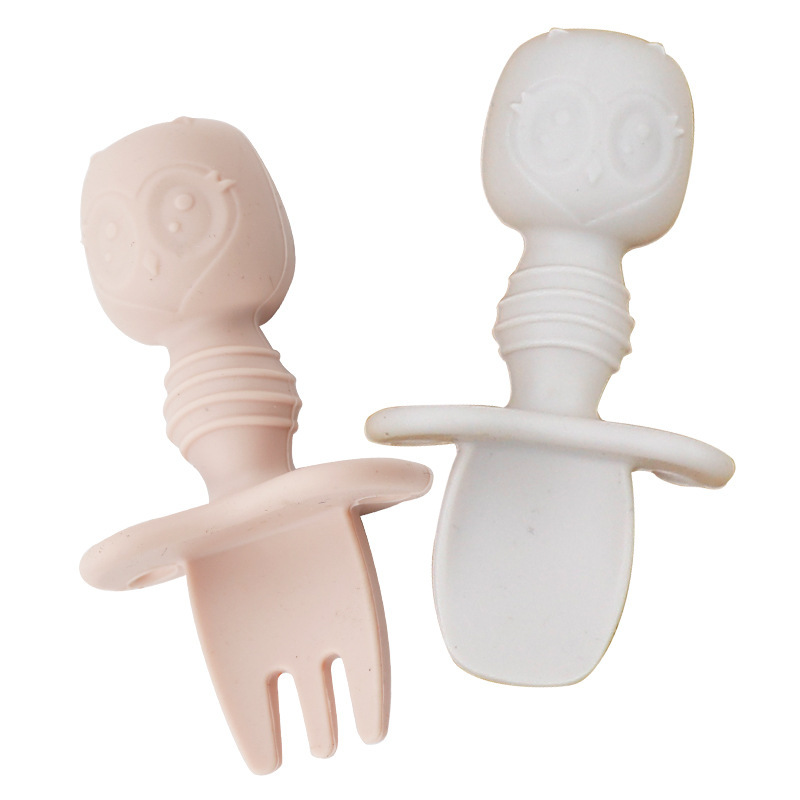 Baby Silicone Owl Training Spoon and Fork Set for Infants to Learn Eating with Silicone Spoon and Fork with a Guard