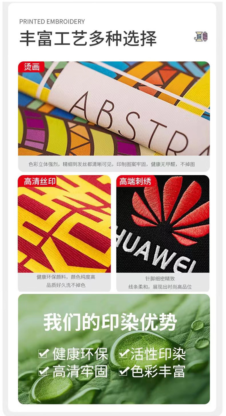 Custom-made designs, company uniforms, printing of logos, patterns, and company emblems... etc. All require additional printing fees.