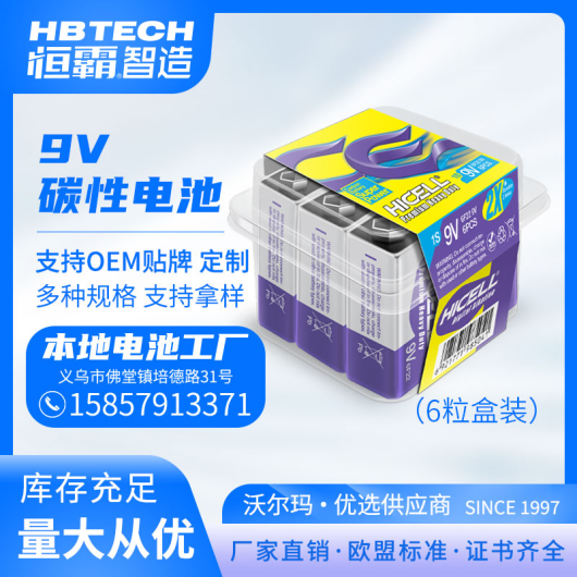 Factory Direct Sale HICELL 9V 6F22 Carbon Battery Plastic Box 6 Package European Standard Premium Heavy Duty Battery 9V
