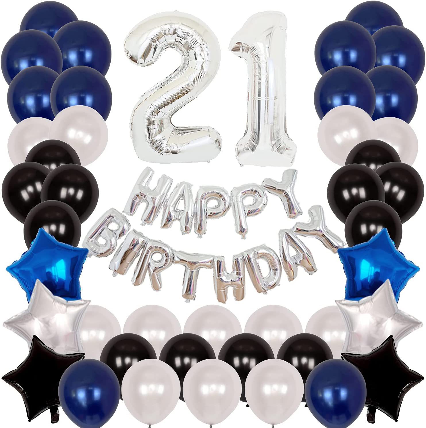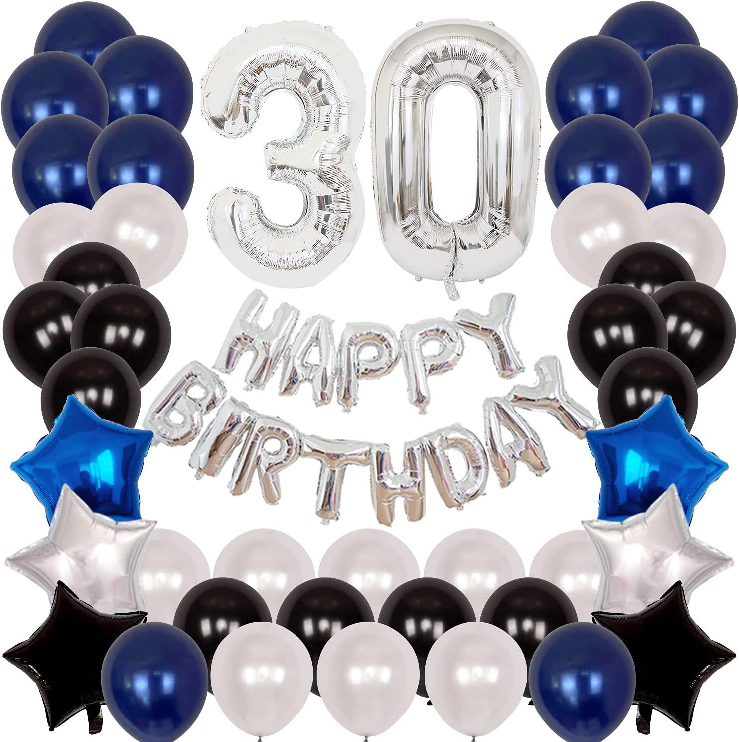 A set of silver birthday letters, 2 numbers 30 inches, 2 blue, silver, and black pentagons.
