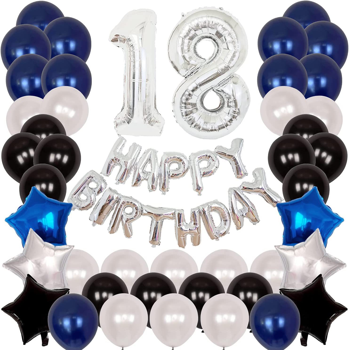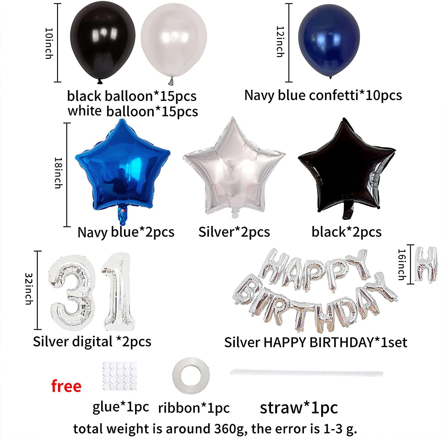 Latex 12 inch dark blue 10 pieces,10 inch black 15 pieces, 10 inch white 15 pieces with adhesive tape, 1 piece of ribbon, 1 straw