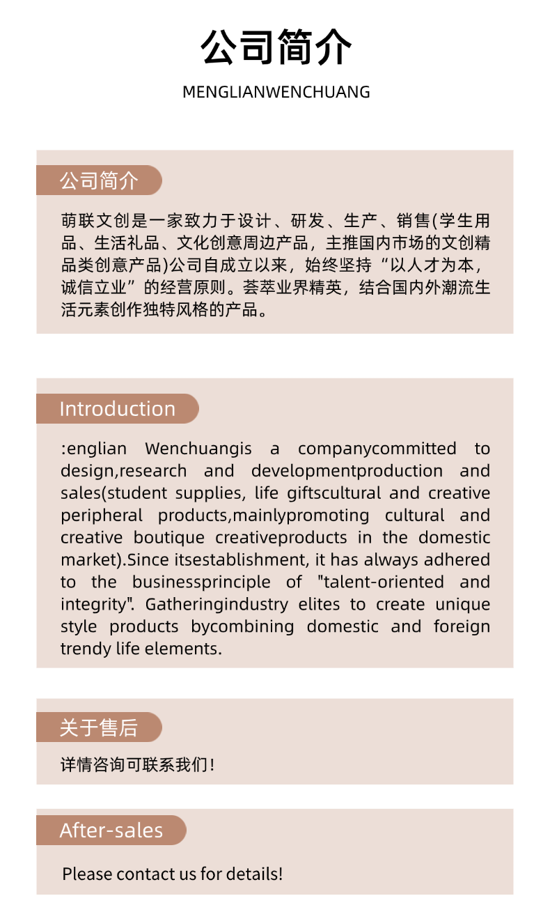 Introduction: Menglian Culture Creationis a company dedicated to the design, research and development, production, and sales of (student supplies, lifestyle gifts, cultural and creative peripherals, with a focus on cultural and creative premium products in the domestic market). Since its establishment, the company has always adhered to the philosophy of“People-oriented and Integrity-based Business”The company's business philosophy is to gather elite professionals from the industry, combine domestic and international trends in lifestyle elements to create unique style products.