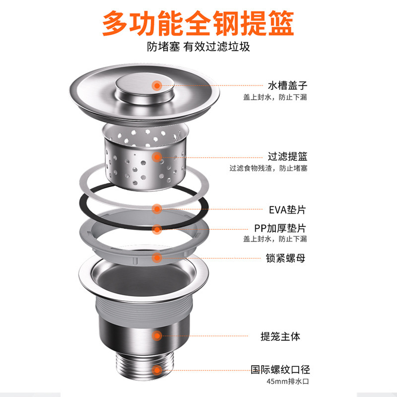 Cross-Border Kitchen Vegetable Basin Stainless Steel Drainer Sink Sink Drainage Drain Cap Suit Downcomer Accessories