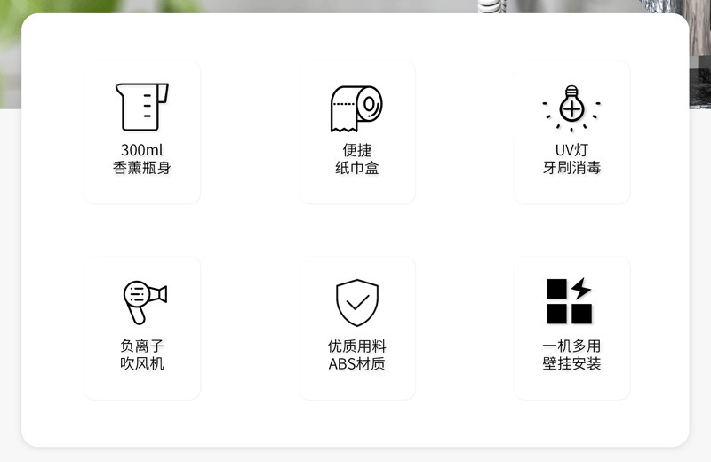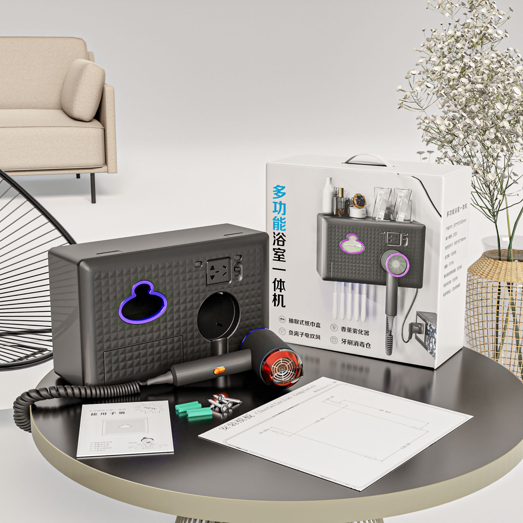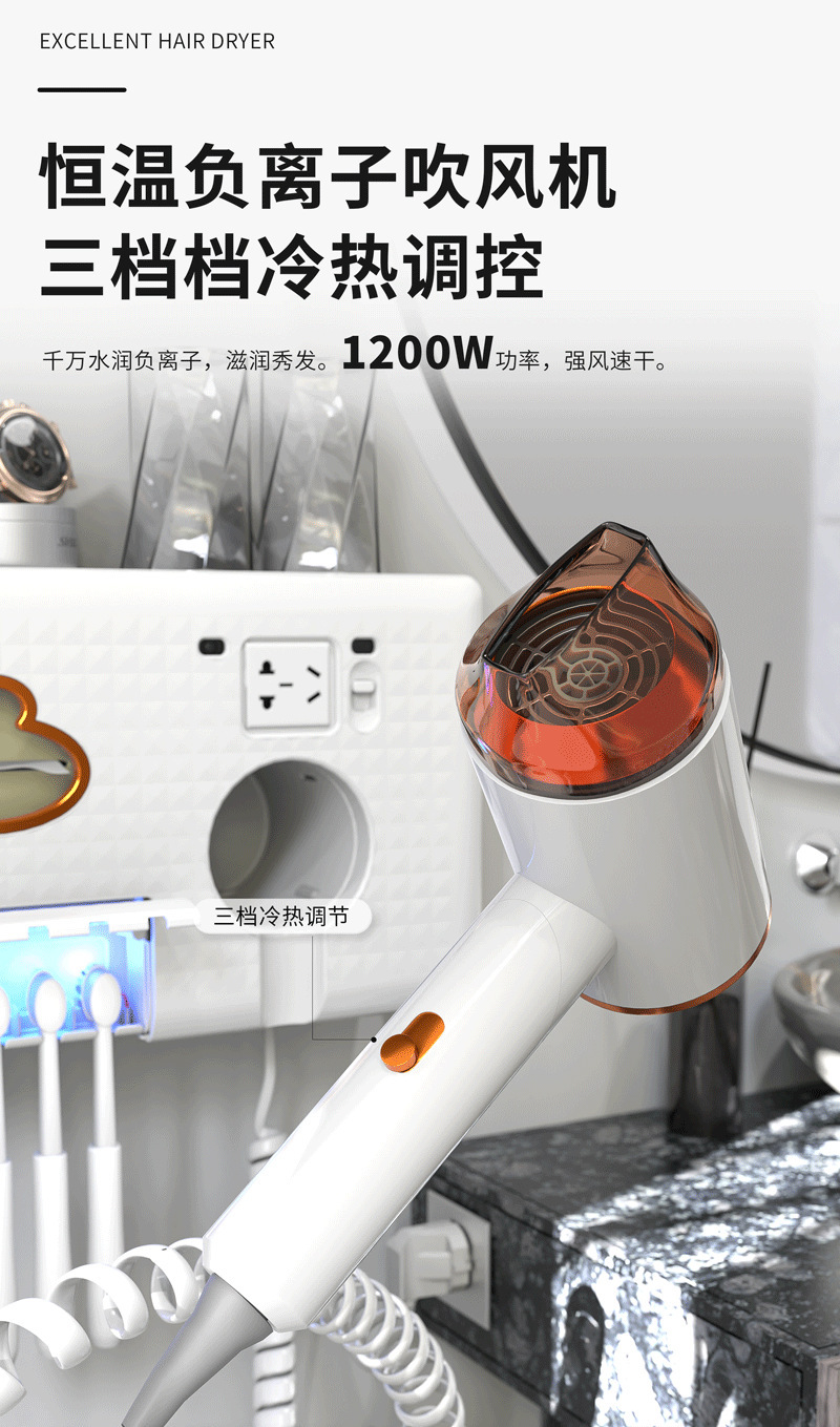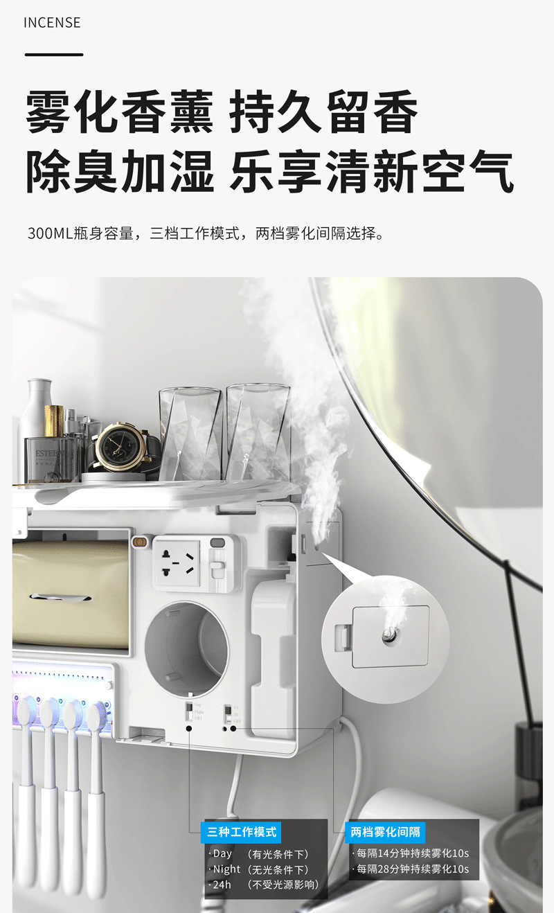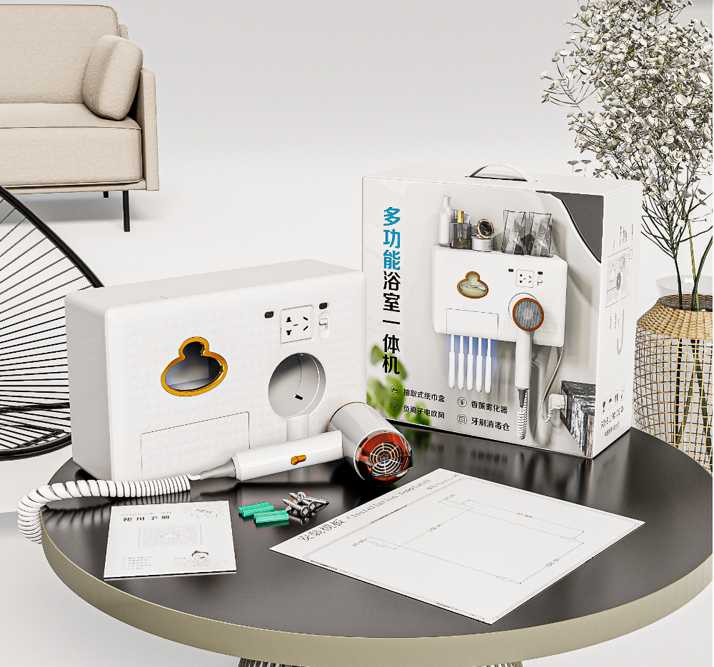 New Exclusive for Cross-Border Multi-Functional Bathroom Wall-Mounted Storage Rack Toothbrush Disinfection Hair Dryer Aromatherapy Tissue Box 中文版